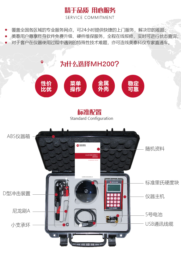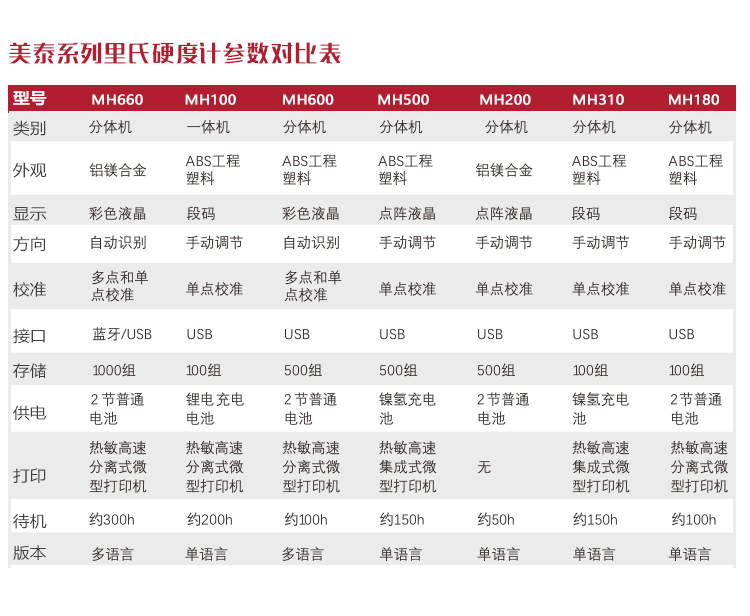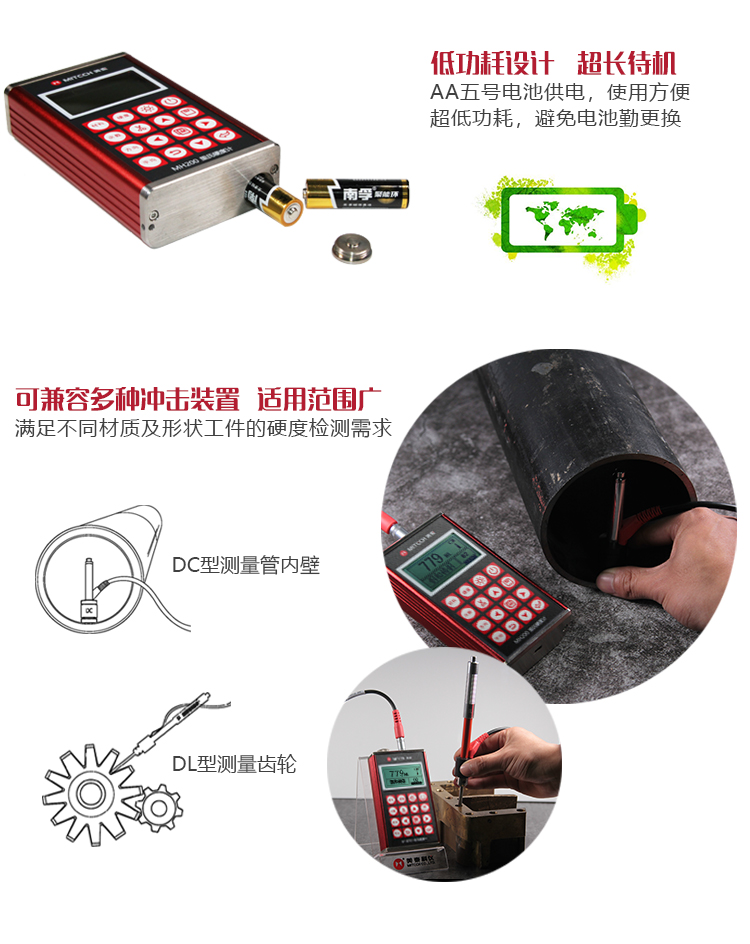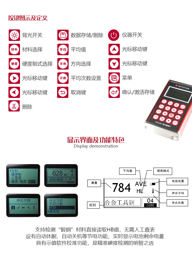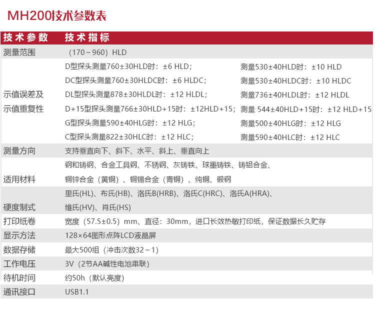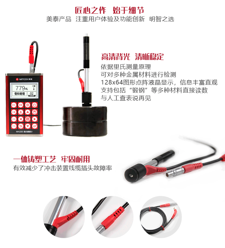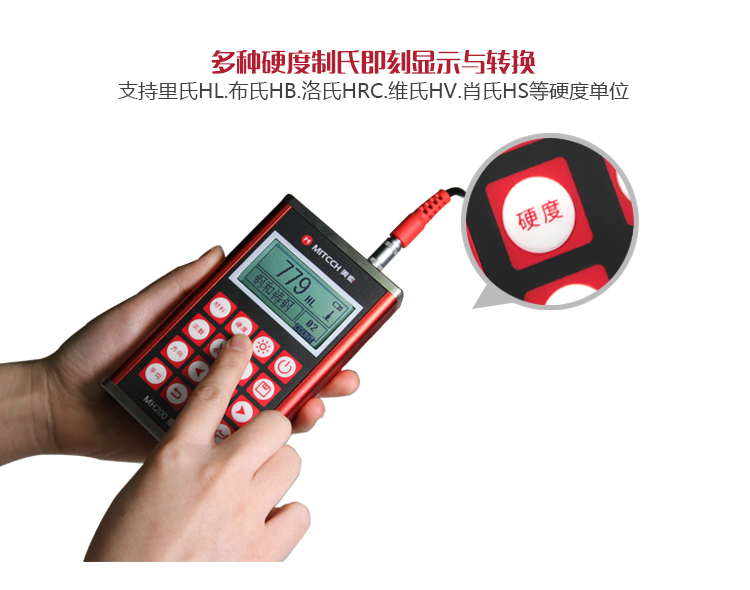 產(chǎn)品概述MH200便攜式里氏硬度計(jì),基于里氏硬度測量原理,可方便快捷地現(xiàn)場檢測多種金屬材料的硬度,支持里氏、布氏、洛氏等多種硬度制氏間的自由轉(zhuǎn)換。它采用國際流行的全封閉鋁美合金外殼,堅(jiān)固耐用,擁有強(qiáng)大的抗電磁、抗振動(dòng)、抗干擾能力;低功耗設(shè)計(jì)依托穩(wěn)定的IC集成電路,性能可靠;全中文點(diǎn)陣液晶顯示,菜單式操作簡單快捷;支持PC機(jī)通訊及打印功能。被廣泛應(yīng)用于退火、回火、淬火熱處理工件的質(zhì)量控制;機(jī)床導(dǎo)軌、汽車底盤的硬度檢測;大型不可拆卸零部件的現(xiàn)場在役硬度測試;五金、鍛造、機(jī)床、特種鋼材的質(zhì)量檢測;批量生產(chǎn)過程中產(chǎn)品的質(zhì)量控制等,質(zhì)優(yōu)價(jià)廉,實(shí)用經(jīng)濟(jì),是硬度檢測常規(guī)需求的明智之選。