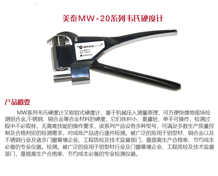 產(chǎn)品概述MW-20系列鋁合金系列韋氏硬度計(jì)又稱(chēng)鉗式硬度計(jì),基于機(jī)械壓入測(cè)量原理,可方便快捷地現(xiàn)場(chǎng)檢測(cè)鋁合金材料的硬度。它們體積小、重量輕、單手可操作,檢測(cè)過(guò)程中不必取樣,無(wú)高難技能的操作要求。該系列產(chǎn)品設(shè)有多種型號(hào),可滿(mǎn)足多數(shù)生產(chǎn)質(zhì)量控制及合格判定的檢測(cè)需求,對(duì)成批產(chǎn)品進(jìn)行逐件檢測(cè)。被廣泛的應(yīng)用于鋁型材行業(yè)及諸多門(mén)窗幕墻企業(yè)、工程質(zhì)檢及技術(shù)監(jiān)督部門(mén),是提高生產(chǎn)合格率、節(jié)約成本必備的專(zhuān)業(yè)儀器。