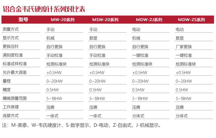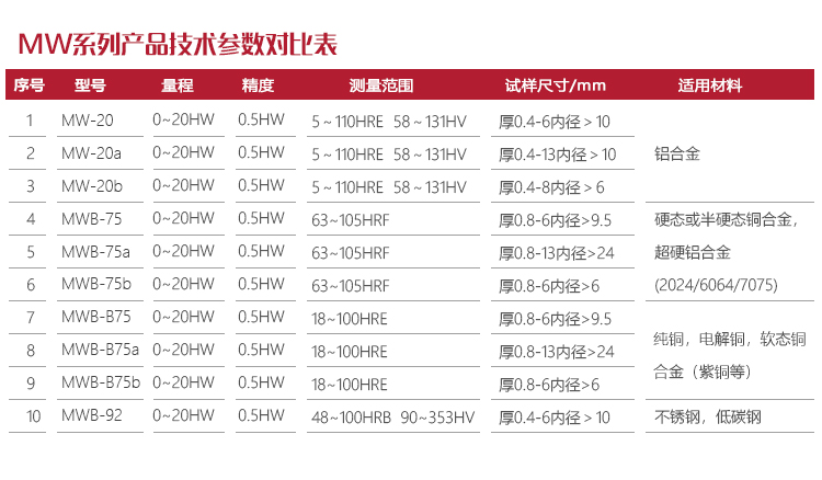 操作方法及注意事項(xiàng)MW-20系列鋁合金韋氏硬度計(jì)設(shè)有MW-20、MW-20a、MW-20b三種型號(hào)。MW-20型為通用型,用于測(cè)量厚度在0.8-6.0mm材料;MW-20a型為厚材專(zhuān)用型,用于測(cè)量厚度在6.0-13mm的材料;MW-20b型為細(xì)管材專(zhuān)用型,用于測(cè)量?jī)?nèi)徑為6.0mm以上的管材。三種型號(hào)的儀器均可用于測(cè)量管材、板材和型材。