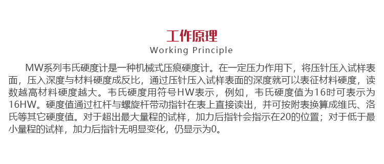 工作原理MW-20系列鋁合金系列韋氏硬度計(jì)是一種機(jī)械式壓痕硬度計(jì)。在一定壓力作用下,將壓針壓入試樣表面,壓針壓入試樣表面的深度與材料硬度成反比,通過(guò)杠桿與螺旋桿帶動(dòng)指針將壓入深度轉(zhuǎn)換為材料硬度值并在表盤(pán)上顯示出測(cè)量結(jié)果。韋氏硬度用符號(hào)HW表示,例如,韋氏硬度值為16時(shí)可表示為16HW。測(cè)得的韋氏硬度值可依據(jù)附表?yè)Q算成維氏、洛氏等其它硬度值。對(duì)于超出最大量程的試樣,加力后指針會(huì)指示在表盤(pán)滿(mǎn)刻度值20的位置;對(duì)于低于最小量程的試樣,加力后指針無(wú)明顯變化,仍顯示為0。