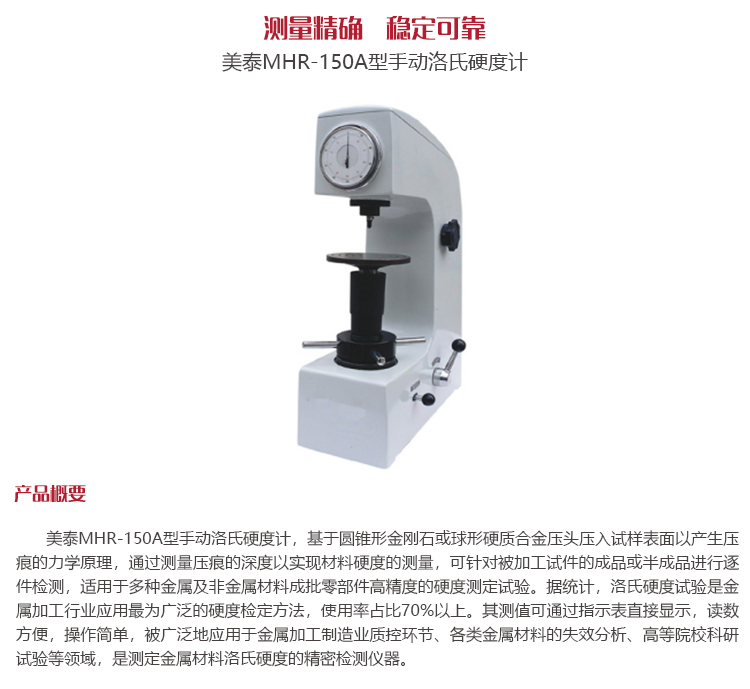產(chǎn)品概述美泰MHR-150A型手動(dòng)洛氏硬度計(jì),基于圓錐形金剛石或球形硬質(zhì)合金壓頭壓入試樣表面以產(chǎn)生壓痕的力學(xué)原理,通過(guò)測(cè)量壓痕的深度以實(shí)現(xiàn)材料硬度的測(cè)量,可針對(duì)被加工試件的成品或半成品進(jìn)行逐件檢測(cè),適用于多種金屬及非金屬材料成批零部件高精度的硬度測(cè)定試驗(yàn)。據(jù)統(tǒng)計(jì),洛氏硬度試驗(yàn)是金屬加工行業(yè)應(yīng)用最為廣泛的硬度檢定方法,使用率占比70%以上。其測(cè)值可通過(guò)指示表直接顯示,讀數(shù)方便,操作簡(jiǎn)單,被廣泛地應(yīng)用于金屬加工制造業(yè)質(zhì)控環(huán)節(jié)、各類金屬材料的失效分析、高等院??蒲?/span>試驗(yàn)等領(lǐng)域,是測(cè)定金屬材料洛氏硬度的精密檢測(cè)儀器。