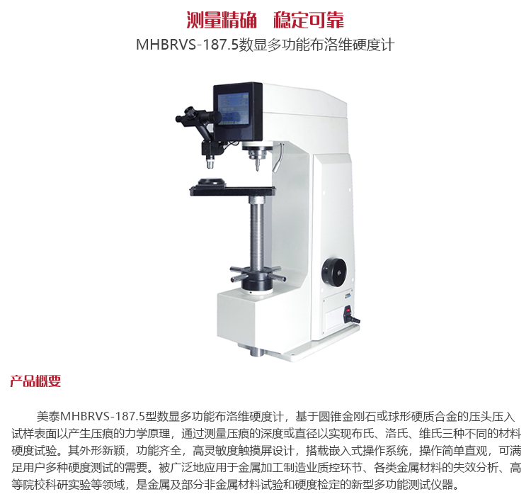美泰MHBRVS-187.5型數(shù)顯多功能布洛維硬度計,基于圓錐金剛石或球形硬質(zhì)合金的壓頭壓入試樣表面以產(chǎn)生壓痕的力學(xué)原理,通過測量壓痕的深度或直徑以實(shí)現(xiàn)布氏、洛氏、維氏三種不同的材料硬度試驗。其外形新穎,功能齊全,高靈敏度觸摸屏設(shè)計,搭載嵌入式操作系統(tǒng),操作簡單直觀,可滿足用戶多種硬度測試的需要。被廣泛地應(yīng)用于金屬加工制造業(yè)質(zhì)控環(huán)節(jié)、各類金屬材料的失效分析、高等院??蒲袑?shí)驗等領(lǐng)域,是金屬及部分非金屬材料研究和硬度檢定的新型多功能測試儀器。