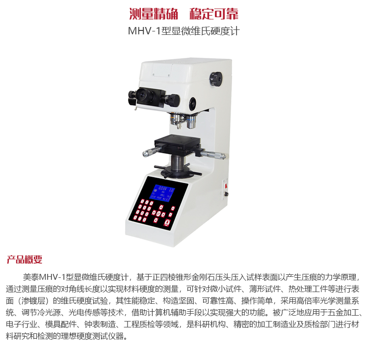 產(chǎn)品概述美泰MHV-1型顯微維氏硬度計(jì),基于正四棱錐形金剛石壓頭壓入試樣表面以產(chǎn)生壓痕的力學(xué)原理,通過測量壓痕的對(duì)角線長度以實(shí)現(xiàn)材料硬度的測量,可針對(duì)微小試件、薄形試件、熱處理工件等進(jìn)行表面(滲鍍層)的維氏硬度試驗(yàn),其性能穩(wěn)定、構(gòu)造堅(jiān)固、可靠性高、操作簡單,采用高倍率光學(xué)測量系統(tǒng)、調(diào)節(jié)冷光源、光電傳感等技術(shù),借助計(jì)算機(jī)輔助手段以實(shí)現(xiàn)強(qiáng)大的功能。被廣泛地應(yīng)用于五金加工、電子行業(yè)、模具配件、鐘表制造、工程質(zhì)檢等領(lǐng)域,是科研機(jī)構(gòu)、精密的加工制造業(yè)及質(zhì)檢部門進(jìn)行材料研究和檢測的理想硬度測試儀器。