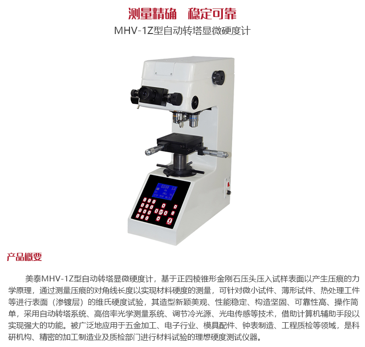 產(chǎn)品概述美泰MHV-1Z型自動轉(zhuǎn)塔顯微硬度計,基于正四棱錐形金剛石壓頭壓入試樣表面以產(chǎn)生壓痕的力學原理,通過測量壓痕的對角線長度以實現(xiàn)材料硬度的測量,可針對微小試件、薄形試件、熱處理工件等進行表面(滲鍍層)的維氏硬度試驗,其造型新穎美觀、性能穩(wěn)定、構(gòu)造堅固、可靠性高、操作簡單,采用自動轉(zhuǎn)塔系統(tǒng)、高倍率光學測量系統(tǒng)、調(diào)節(jié)冷光源、光電傳感等技術(shù),借助計算機輔助手段以實現(xiàn)強大的功能。被廣泛地應(yīng)用于五金加工、電子行業(yè)、模具配件、鐘表制造、工程質(zhì)檢等領(lǐng)域,是科研機構(gòu)、精密的加工制造業(yè)及質(zhì)檢部門進行材料試驗的理想硬度測試儀器。