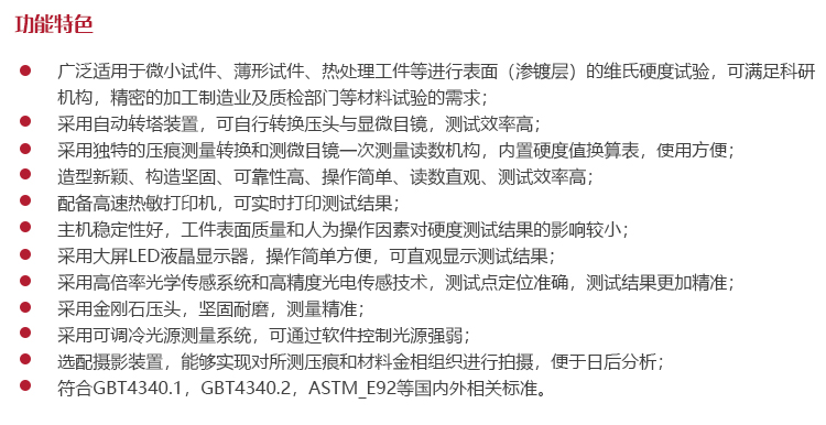 儀器特點廣泛適用于微小試件、薄形試件、熱處理工件等進行表面(滲鍍層)的維氏硬度試驗,可滿足科研機構(gòu),精密的加工制造業(yè)及質(zhì)檢部門等材料試驗的需求;