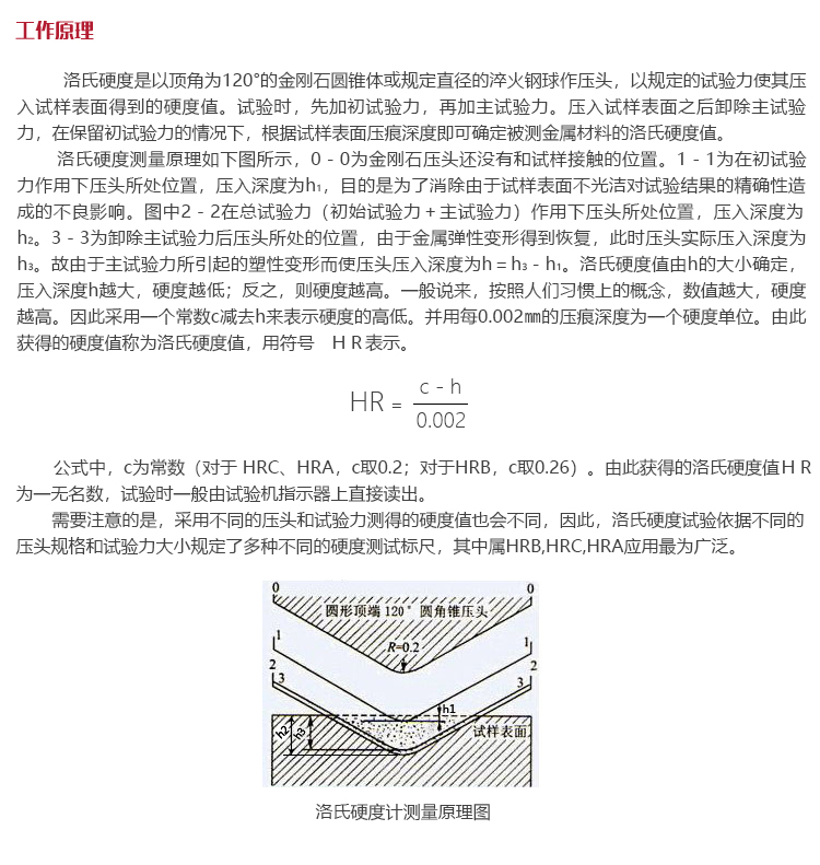公式中,c為常數(shù)(對于 HRC、HRA,c取0.2;對于HRB,c取0.26)。由此獲得的洛氏硬度值HR為一無名數(shù),試驗(yàn)時(shí)一般由試驗(yàn)機(jī)指示器上直接讀出。