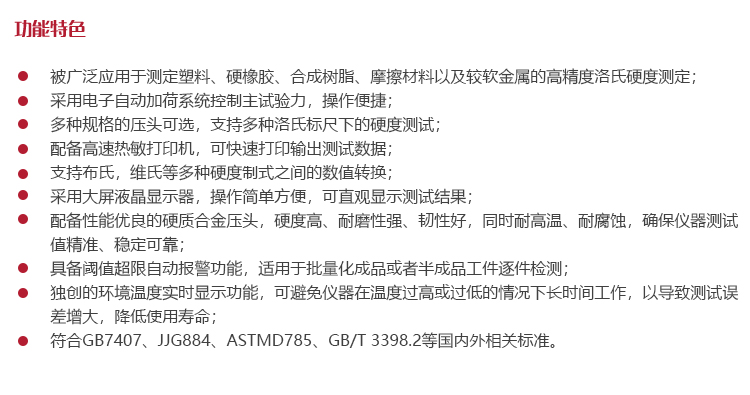 儀器特點(diǎn)?被廣泛應(yīng)用于測定塑料、硬橡膠、合成樹脂、摩擦材料以及較軟金屬的高精度洛氏硬度測定;