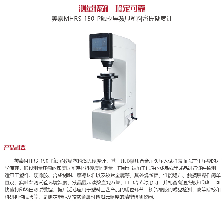產(chǎn)品概述美泰MHRS-150-P觸屏數(shù)顯塑料洛氏硬度計(jì),基于球形硬質(zhì)合金壓頭壓入試樣表面以產(chǎn)生壓痕的力學(xué)原理,通過測量壓痕的深度以實(shí)現(xiàn)材料硬度的測量,可針對被加工試件的成品或半成品進(jìn)行逐件檢測,適用于塑料、硬橡膠、合成樹脂、摩擦材料以及較軟金屬等,其外觀新穎、性能穩(wěn)定、觸摸屏操作簡單直觀、實(shí)時(shí)監(jiān)測試驗(yàn)環(huán)境溫度、液晶顯示讀數(shù)直觀方便、LED冷光源照明,并配備高速熱敏打印機(jī),可快速打印輸出測試數(shù)據(jù),被廣泛地應(yīng)用于塑料工藝產(chǎn)品的質(zhì)控環(huán)節(jié)、樹脂橡膠的成品檢測、高等院校和科研機(jī)構(gòu)試驗(yàn)等,是測定塑料及較軟金屬材料洛氏硬度的精密檢測儀器。