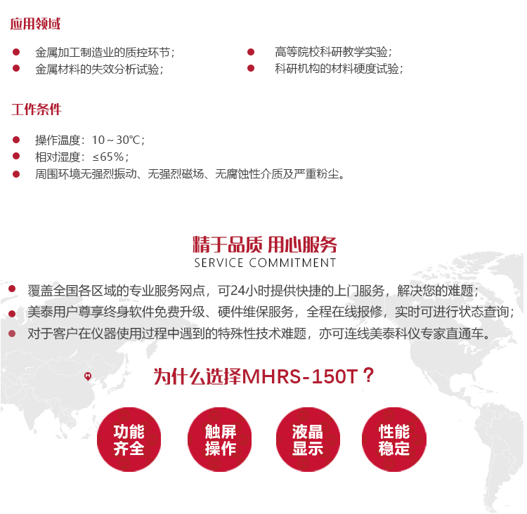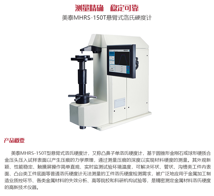 產(chǎn)品概述美泰MHRS-150T型懸臂式洛氏硬度計,又稱凸鼻子單洛氏硬度計,基于圓錐形金剛石或球形硬質(zhì)合金壓頭壓入試樣表面以產(chǎn)生壓痕的力學原理,通過測量壓痕的深度以實現(xiàn)材料硬度的測量。其外觀新穎、性能穩(wěn)定、觸摸屏操作簡單直觀、實時監(jiān)測試驗環(huán)境溫度,可解決環(huán)狀、管狀、溝槽類工件內(nèi)表面、凸臺類工件底面等普通洛氏硬度計無法測量的工件洛氏硬度檢測需求,被廣泛地應用于金屬加工制造業(yè)質(zhì)控環(huán)節(jié)、各類金屬材料的失效分析、高等院校和科研機構(gòu)試驗等,是精密測定金屬材料洛氏硬度的高新技術(shù)儀器。
