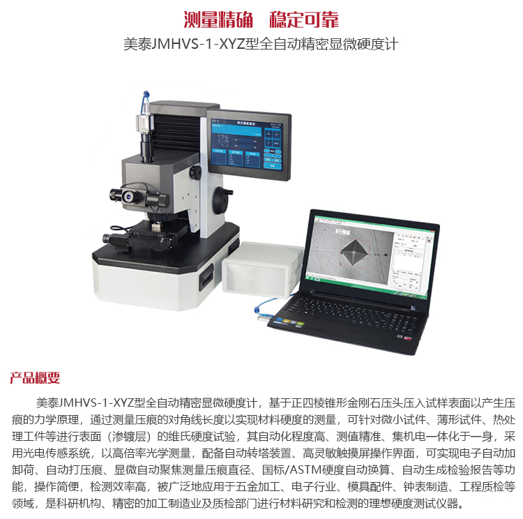 產(chǎn)品概述美泰JMHVS-1-XYZ型全自動精密顯微硬度計,基于正四棱錐形金剛石壓頭壓入試樣表面以產(chǎn)生壓痕的力學(xué)原理,通過測量壓痕的對角線長度以實現(xiàn)材料硬度的測量,可針對微小試件、薄形試件、熱處理工件等進行表面(滲鍍層)的維氏硬度試驗,其自動化程度高、測值精準(zhǔn)、集機電一體化于一身,采用光電傳感系統(tǒng),以高倍率光學(xué)測量,配備自動轉(zhuǎn)塔裝置、高靈敏觸摸屏操作界面、可實現(xiàn)電子自動加卸荷、自動打壓痕、顯微自動聚焦測量壓痕直徑、國標(biāo)/ASTM硬度自動換算、自動生成檢驗報告等功能,操作簡便,檢測效率高,被廣泛地應(yīng)用于五金加工、電子行業(yè)、模具配件、鐘表制造、工程質(zhì)檢等領(lǐng)域,是科研機構(gòu)、精密的加工制造業(yè)及質(zhì)檢部門進行材料研究和檢測的理想硬度測試儀器。