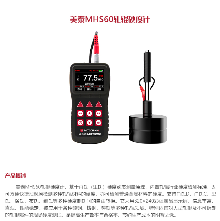 產(chǎn)品概述美泰MHS60軋輥硬度計,基于肖氏(里氏)硬度動態(tài)測量原理,內(nèi)置軋輥行業(yè)硬度檢測標(biāo)準(zhǔn),既可方便快捷地現(xiàn)場檢測多種軋輥材料的硬度,亦可檢測普通金屬材料的硬度。支持肖氏D、肖氏C、里氏,洛氏、布氏、維氏等多種硬度制氏間的自由轉(zhuǎn)換。它采用320×240彩色液晶顯示屏,信息豐富、直觀、性能穩(wěn)定。被應(yīng)用于各種鍛鋼、鑄鋼、鑄鐵等多種軋輥領(lǐng)域。特別適宜對大型軋輥及不可拆卸的軋輥部件的現(xiàn)場硬度測試。是提高生產(chǎn)效率與合格率、節(jié)約生產(chǎn)成本的明智之選。