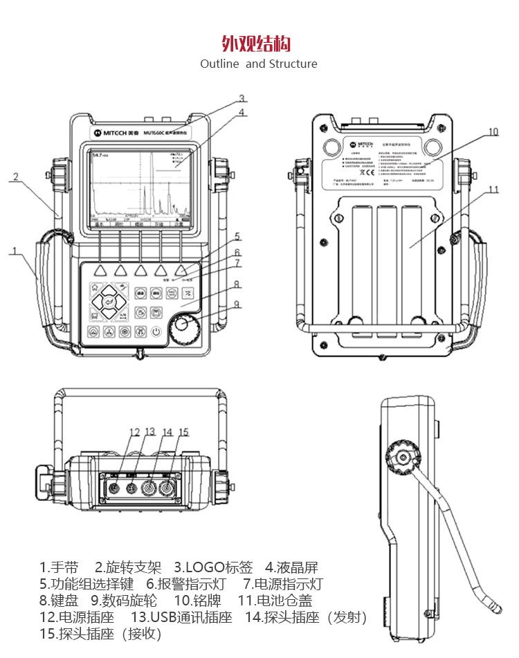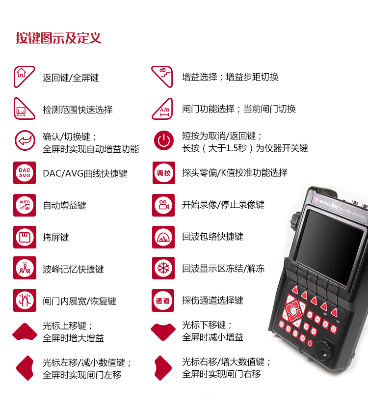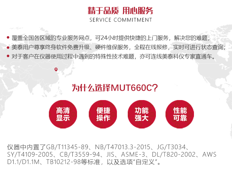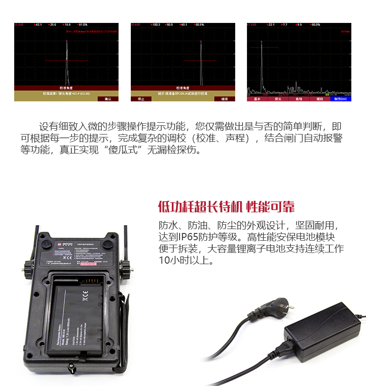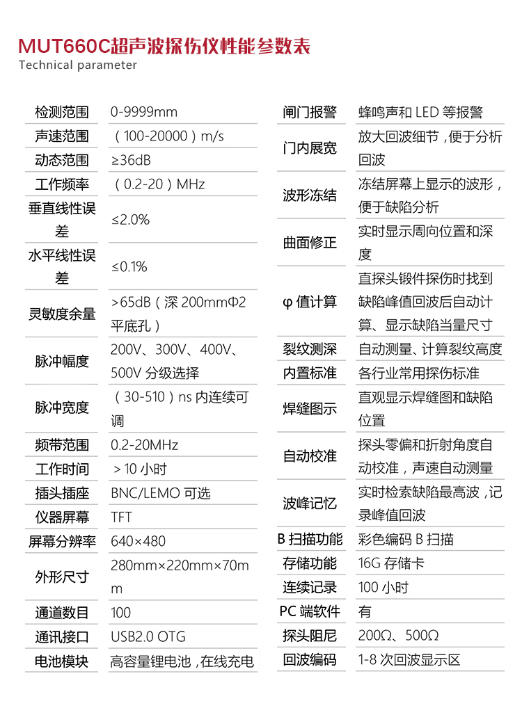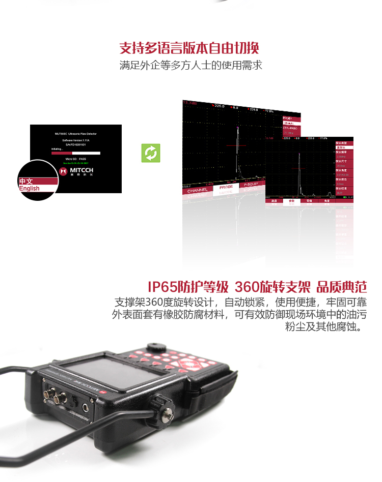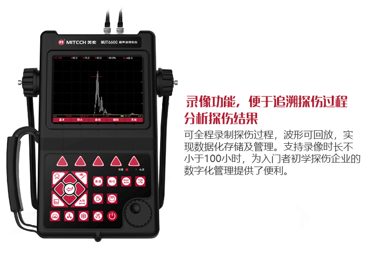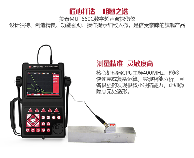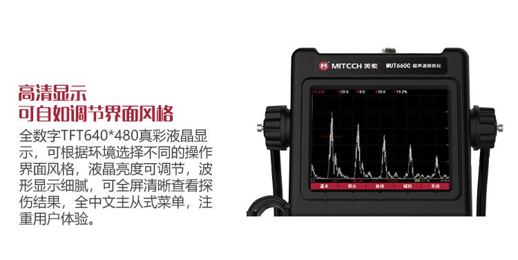 產(chǎn)品概述MUT660C智能數(shù)字式超聲波探傷儀是美泰公司專注多年精心研制的旗艦產(chǎn)品,其設(shè)計(jì)獨(dú)特、制造精良、操作便捷、功能強(qiáng)勁,集諸多優(yōu)勢于一身,自問世以來一直倍受用戶親睞,它能夠快速便捷、無損傷、精確地進(jìn)行工件內(nèi)部多種缺陷(裂紋、夾雜、氣孔等)的檢測、定位、評估和診斷。采用全數(shù)字TFT 640×480真彩色液晶顯示屏,可根據(jù)環(huán)境選擇操作界面風(fēng)格,液晶亮度可調(diào)節(jié),界面設(shè)計(jì)人性化、波形顯示細(xì)膩;可全屏清晰發(fā)現(xiàn)缺陷;單手可把持操作,曲線制作、探頭校準(zhǔn)等常規(guī)操作均可自動(dòng)完成;核心處理器CPU主頻400M,能快速完成復(fù)雜運(yùn)算,實(shí)現(xiàn)智能缺陷分析;低功耗設(shè)計(jì)配備大容量高性能鋰離子電池模塊可連續(xù)工作10小時(shí)以上;全中文主從式菜單,注重用戶體驗(yàn),集快捷按鍵、數(shù)碼飛梭旋輪、十字菜單三種操作方式于一體,不同使用習(xí)慣均可操作自如;支持多語言。防水、防油、防塵可達(dá)到IP65防護(hù)等級。是石油、化工、冶金、造船、航空、鐵路等領(lǐng)域缺陷檢測、質(zhì)量控制、在役安全監(jiān)測與壽命評估必備的專業(yè)精密儀器。