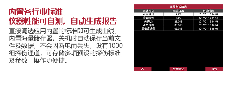 | 探傷標(biāo)準(zhǔn) | 內(nèi)置各行業(yè)常用探傷標(biāo)準(zhǔn),直接調(diào)用,方便、快捷 |