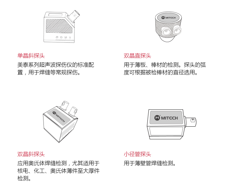 | 探頭類型 | 直探頭、斜探頭、雙晶探頭、穿透探頭 |