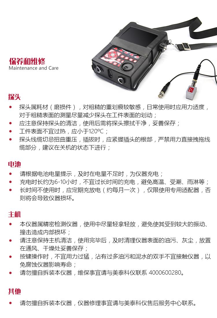 | 美泰標(biāo)準(zhǔn)超聲波探傷儀C系列內(nèi)置電池,電池類型為:鋰電池,電壓:7.2V,電池容量:8800mAh。屬美泰超聲波探傷儀C系列產(chǎn)品的標(biāo)準(zhǔn)配置。使用中,切勿自行拆解電池組;僅限使用本公司提供的專用的電源適配器進(jìn)行充電,否則將會導(dǎo)致電池?fù)p壞,長時(shí)間不使用時(shí),應(yīng)定期充放電(約每月一次),防止失效。 | |