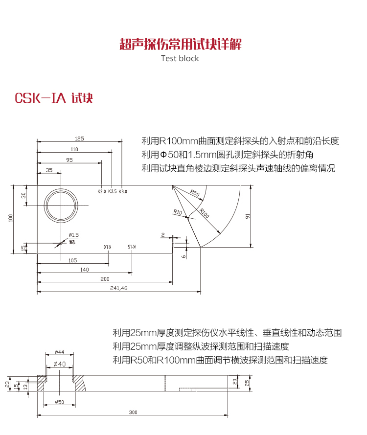 | 規(guī)格:1.25P/2.5P/5P、Φ10、Φ14、Φ20等多種規(guī)格可選,用于薄板、棒材的檢測。探頭的弧度可根據(jù)被測棒材的直徑選用。 | |