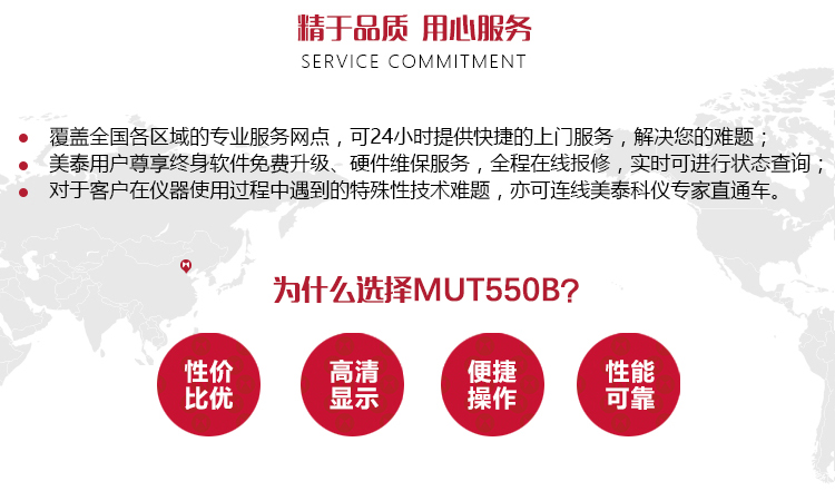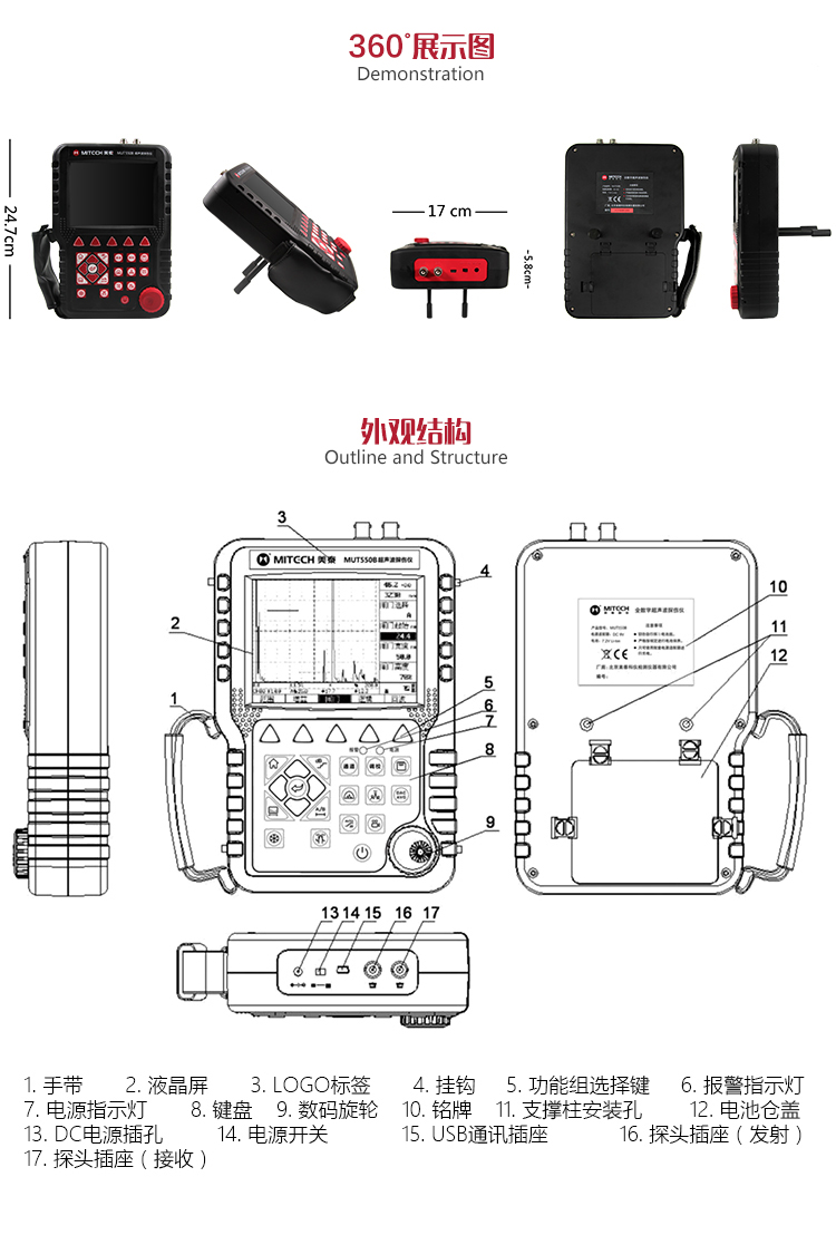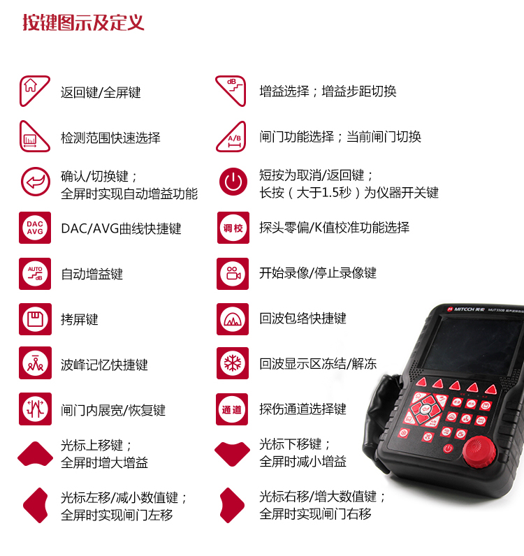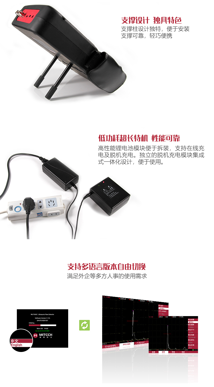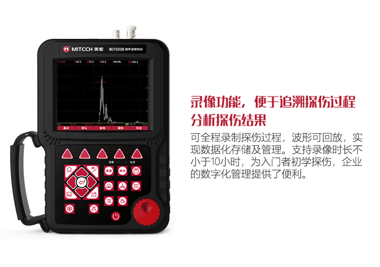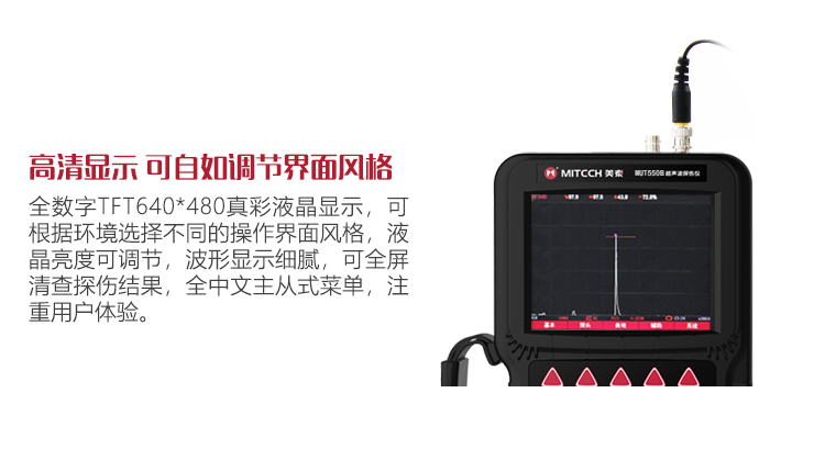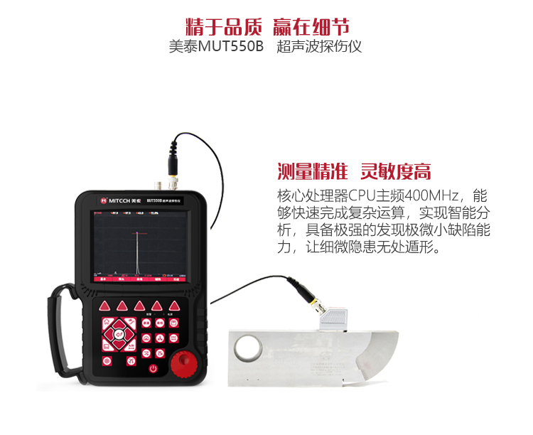 產(chǎn)品概述MUT550B數(shù)字式超聲波探傷儀依據(jù)超聲傳播原理,可精準(zhǔn)、靈敏地進(jìn)行工件內(nèi)部多種缺陷(裂紋、夾雜、氣孔等)的檢測(cè)、定位、評(píng)估和診斷。采用全數(shù)字TFT640×480真彩色液晶顯示屏,在光線昏暗及日光強(qiáng)烈環(huán)境下都能為您呈現(xiàn)清晰缺陷;0-9999mm大量程可滿足制造業(yè)、鋼鐵冶金業(yè)、金屬加工業(yè)、化工業(yè)等常規(guī)的缺陷檢測(cè)需求;低功耗設(shè)計(jì)配備大容量高性能鋰離子電池模塊可連續(xù)工作10小時(shí)以上;全中文主從式菜單,注重用戶體驗(yàn),集快捷按鍵、數(shù)碼飛梭旋輪、十字菜單三種操作方式于一體,不同使用習(xí)慣均可操作自如;設(shè)有綜合性能指標(biāo)自檢功能,可自動(dòng)生成測(cè)試報(bào)告,支持多語(yǔ)言。該產(chǎn)品具有很高的性?xún)r(jià)比,是實(shí)用經(jīng)濟(jì)款超聲檢測(cè)儀器的明智之選。