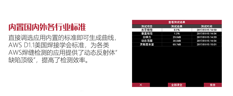 | 探傷標(biāo)準(zhǔn) | 內(nèi)置各行業(yè)常用探傷標(biāo)準(zhǔn),直接調(diào)用,方便、快捷 |