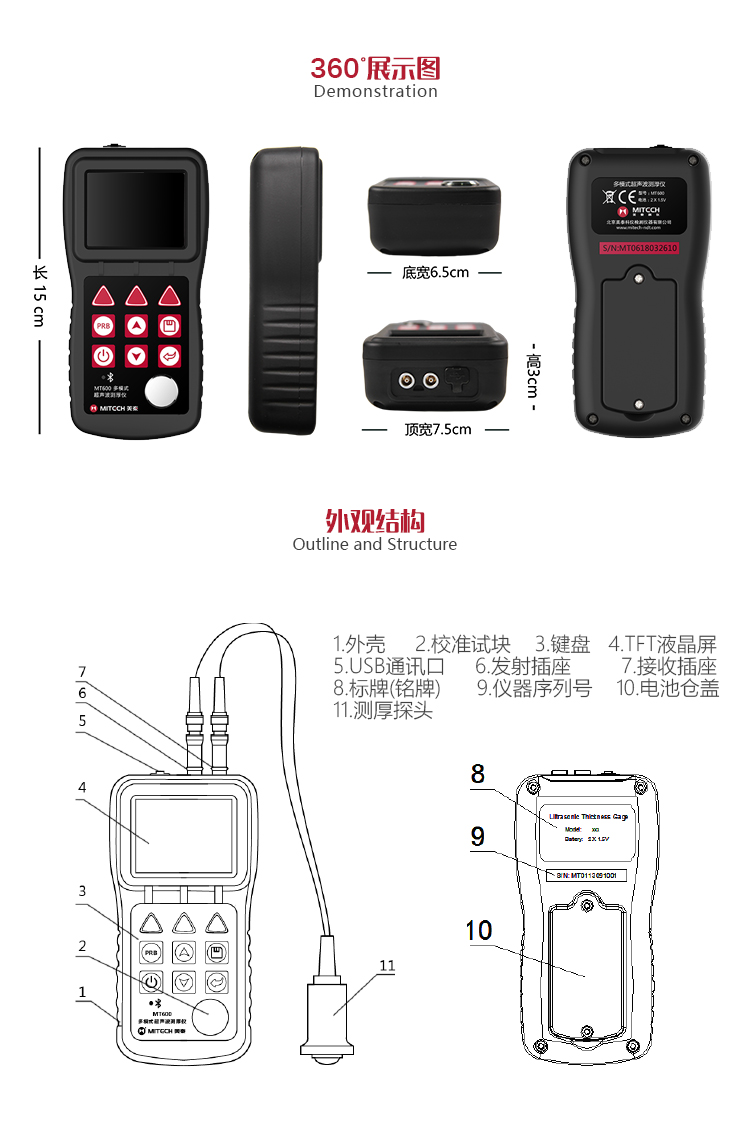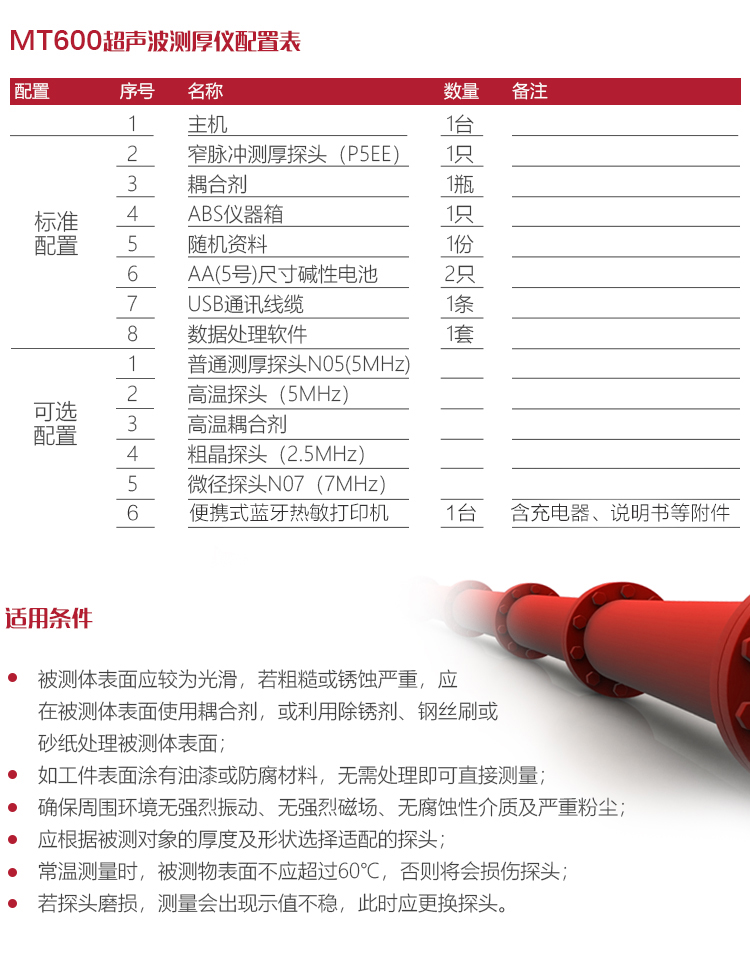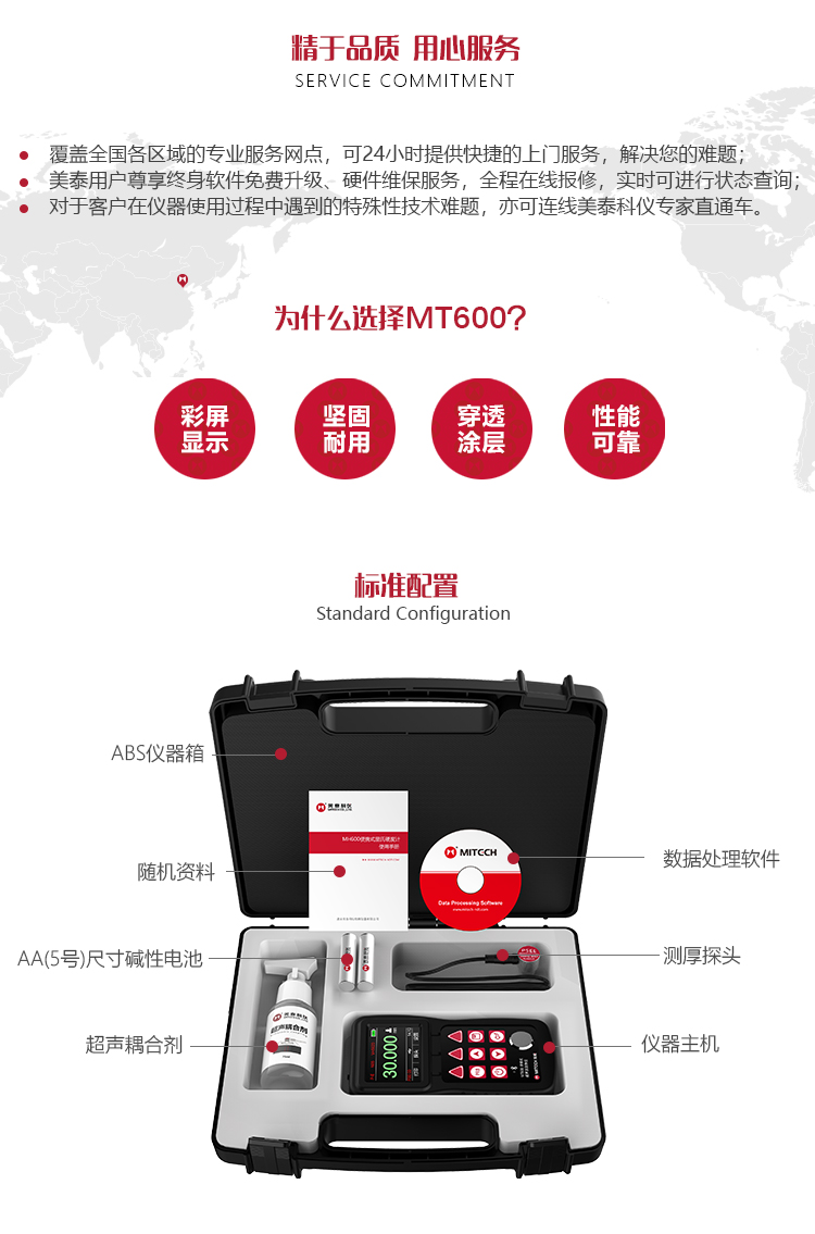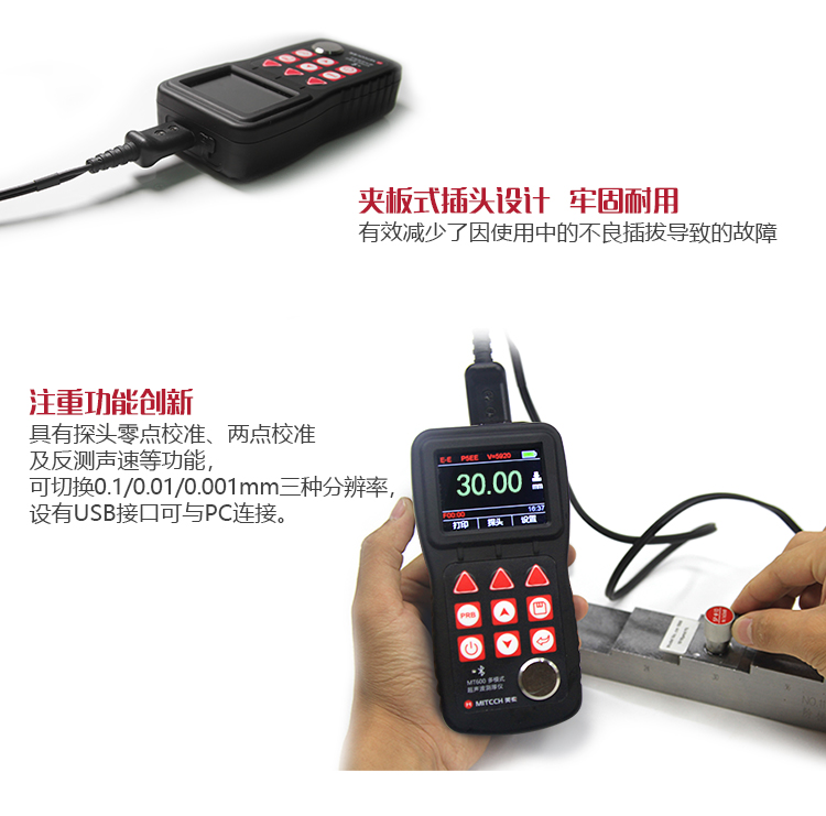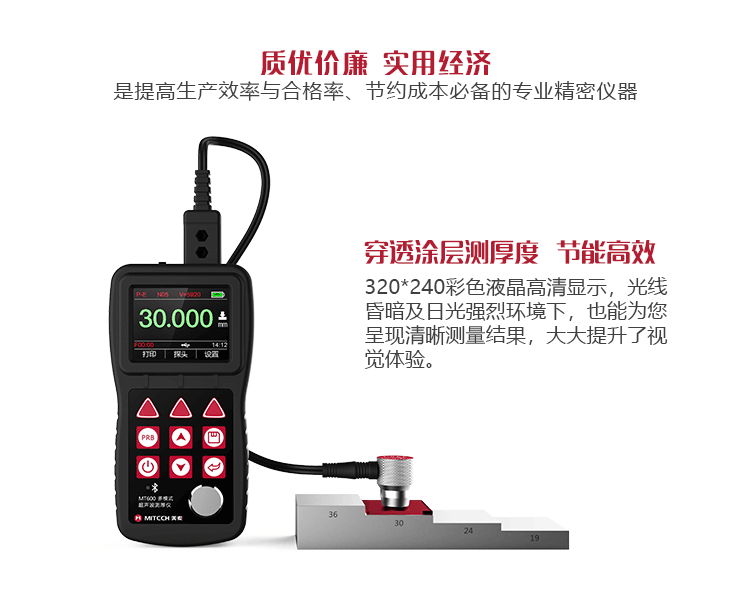 產(chǎn)品概述MT600超聲波測(cè)厚儀是美泰公司強(qiáng)力推出的升級(jí)產(chǎn)品,它更加注重用戶(hù)體驗(yàn)及功能創(chuàng)新,采用320×240彩色液晶顯示屏,光線(xiàn)昏暗及日光強(qiáng)烈環(huán)境下也能為您呈現(xiàn)清晰測(cè)量結(jié)果,大大提升了視覺(jué)體驗(yàn),IP65防護(hù)等級(jí),可有效防御惡劣現(xiàn)場(chǎng)環(huán)境中的油污、粉塵及其它腐蝕;創(chuàng)新設(shè)計(jì)的語(yǔ)言播報(bào)測(cè)量結(jié)果功能,可方便讀數(shù),超出設(shè)定范圍可自動(dòng)報(bào)警,滿(mǎn)足高效采集材料多點(diǎn)厚度的精準(zhǔn)檢測(cè)需求,支持0.001高精度顯示、藍(lán)牙通訊,兼?zhèn)浯┩竿繉幽J脚c普通模式雙效功能,其獨(dú)特的可穿透涂層測(cè)厚度的性能為表面涂有油漆或防腐材料的工件厚度檢測(cè)提供了更加高效的解決方案,測(cè)量前無(wú)需處理掉表面的涂層,可直接測(cè)量。被廣泛應(yīng)用于石油、化工、冶金、造船、航空、航天等領(lǐng)域的生產(chǎn)設(shè)備中各種管道及壓力容器腐蝕減薄程度的監(jiān)測(cè),也可用于對(duì)各種板材及各種加工零件做精確的測(cè)量。是提高生產(chǎn)效率與合格率、節(jié)約成本必備的專(zhuān)業(yè)精密儀器。