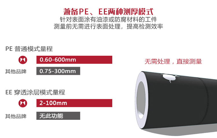 具有兩種測(cè)厚模式:發(fā)射-回波模式和回波-回波模式,可以穿透涂層進(jìn)行厚度測(cè)量而不計(jì)入涂層厚度