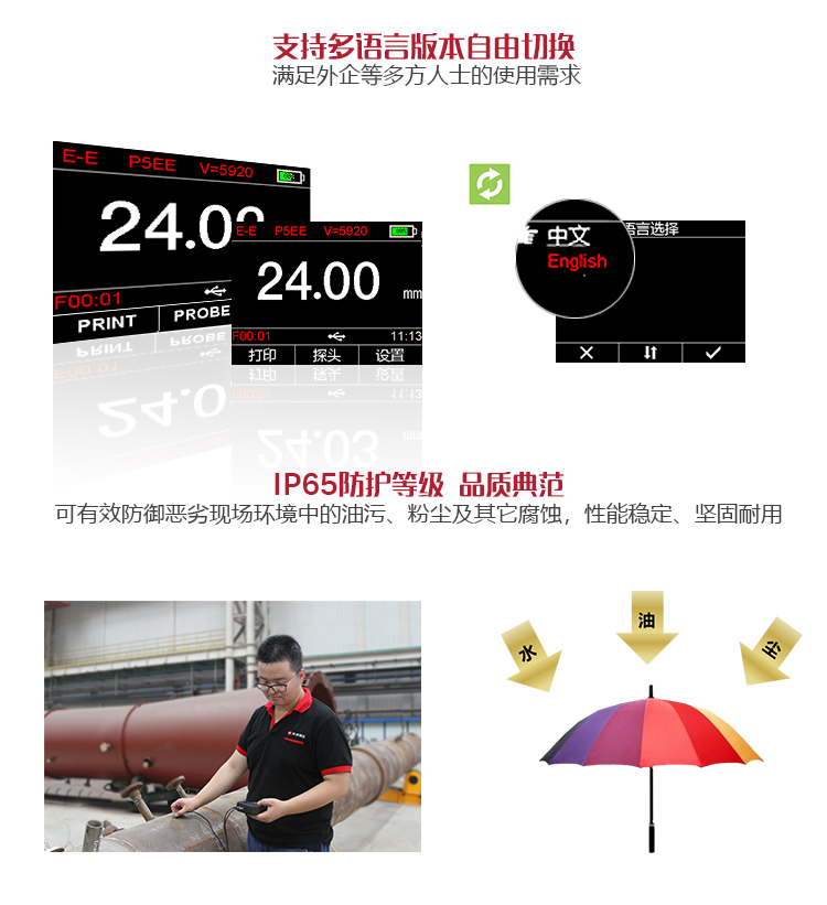 配備窄脈沖復(fù)合材料晶片的高精度探頭,盲區(qū)小、測(cè)量精準(zhǔn)