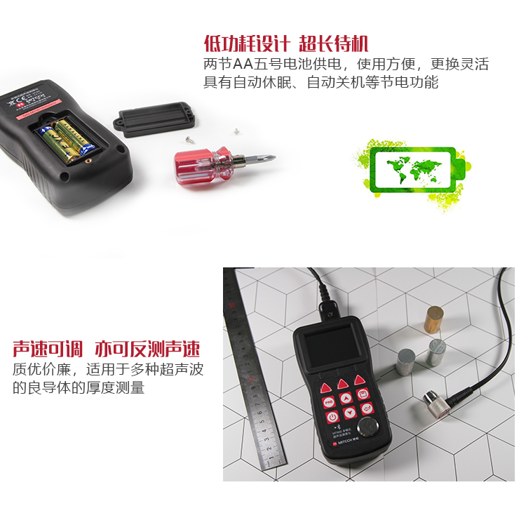 | 美泰系列超聲波測(cè)厚儀,均采用低功耗設(shè)計(jì)理念,超長(zhǎng)待機(jī),MT150/MT160/MT200/MT180/MT192/MT280/MT600/MT660均由兩節(jié)AA五號(hào)電池供電、更換方便。 | |