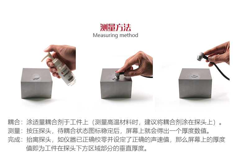 為了使探頭正常工作,必須將探頭表面與待測(cè)工件表面之間的空氣去掉,這需要使用耦合劑來(lái)完成。這種液體之所以稱(chēng)為耦合劑是因?yàn)閺奶筋^中發(fā)射的超聲波經(jīng)過(guò)該液體進(jìn)入待測(cè)工件,其回波又要經(jīng)該液體返回探頭。在測(cè)量前,應(yīng)將少量的耦合劑涂在待測(cè)工件表面。通常情況,一滴就足夠了。