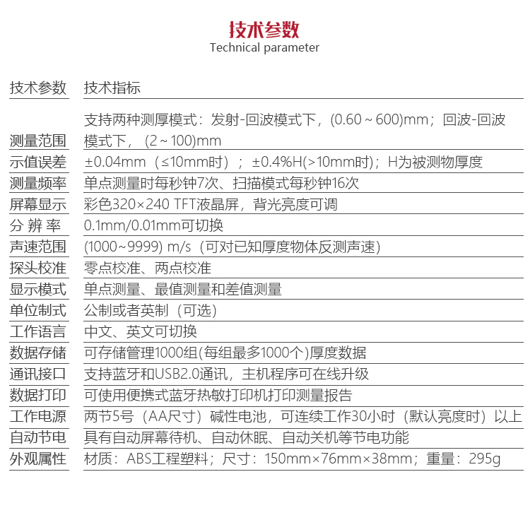 | 存儲(chǔ) | 可存儲(chǔ)管理100組(每組最多100個(gè))厚度數(shù)據(jù) |
