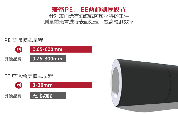 發(fā)射-回波模式(0.65~600mm)(鋼中,探頭分段適用);回波-回波模式(3~60)mm(鋼中,P5EE探頭)