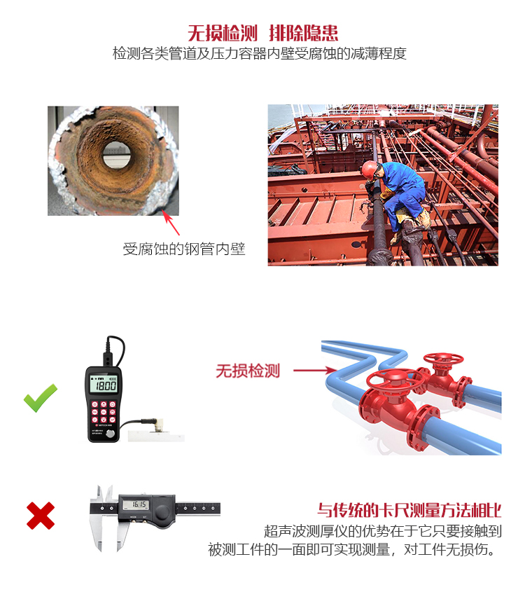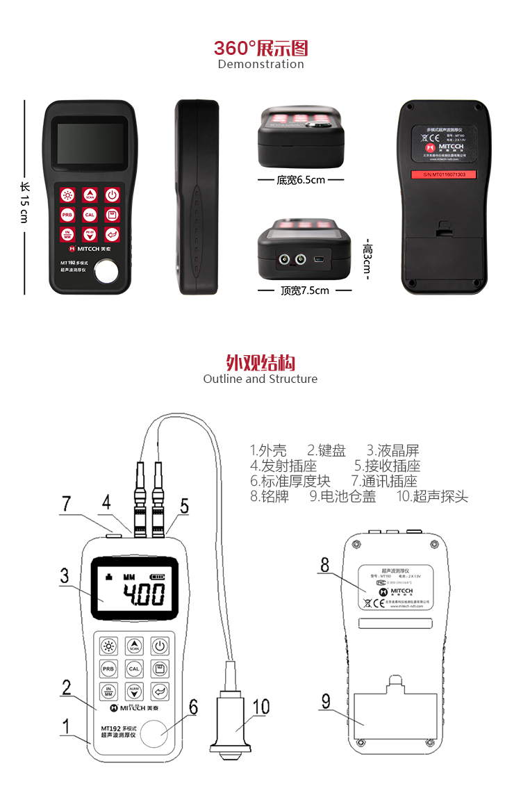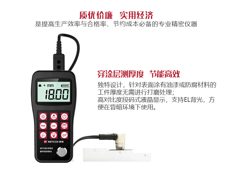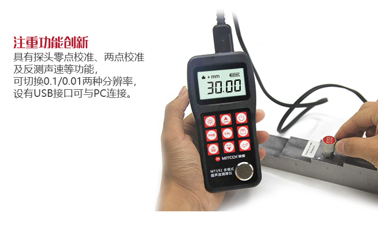 產(chǎn)品概述美泰MT192超聲波測厚儀,基于超聲波測量原理,可對金屬、塑料、陶瓷、玻璃及其他多種超聲波的良導(dǎo)體材料進(jìn)行厚度測量,也可實(shí)現(xiàn)對材料聲速的反測。與傳統(tǒng)的測量方法相比,超聲波測厚儀的優(yōu)勢在于它只要接觸到被測工件的一面即可完成測量,其獨(dú)特的可穿透涂層測厚度的性能為表面涂有油漆或防腐材料的工件厚度檢測提供了更加高效的解決方案,測量前無需處理掉表面的涂層,可以直接測量。被廣泛應(yīng)用于石油、化工、冶金、造船、航空、航天等領(lǐng)域的生產(chǎn)設(shè)備中各種管道及壓力容器腐蝕減薄程度的監(jiān)測,也可用于對各種板材及各種加工零件做精確的測量。是提高生產(chǎn)效率與合格率、節(jié)約成本必備的專業(yè)精密儀器。