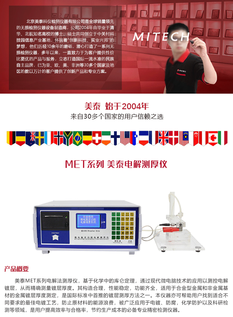 美泰MET系列電解法測(cè)厚儀,基于化學(xué)中的庫(kù)侖定理,通過(guò)現(xiàn)代微電腦技術(shù)的應(yīng)用以測(cè)控電解鍍層,從而精確測(cè)量鍍層厚度。其構(gòu)造合理,性能穩(wěn)定,功能齊全,適用于合金型金屬和非金屬基材的金屬鍍層厚度測(cè)定,是國(guó)際標(biāo)準(zhǔn)中首推的鍍層測(cè)厚方法之一。本儀器亦可幫助用戶(hù)找到適合不同要求的最佳電鍍工藝,防止原材料的能源浪費(fèi),被廣泛應(yīng)用于電鍍、防腐,化學(xué)防護(hù)以及科研檢測(cè)等領(lǐng)域,是用戶(hù)提高效率與合格率,節(jié)約生產(chǎn)成本的必備專(zhuān)業(yè)精密檢測(cè)儀器。
