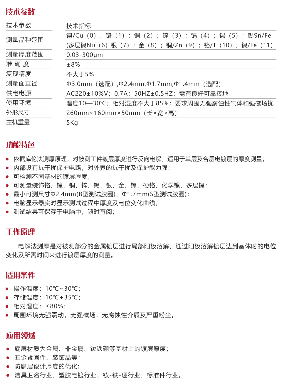 儀器特點(diǎn)l 依據(jù)庫(kù)倫法測(cè)厚原理,對(duì)被測(cè)工件鍍層厚度進(jìn)行反向電解,適用于單層及合層電鍍層的厚度測(cè)量;