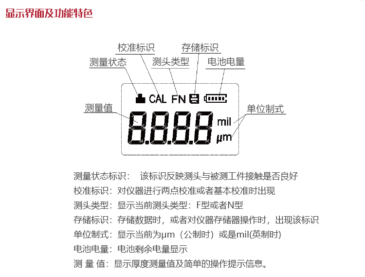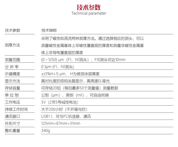 | 測(cè)量范圍 | (0~1250) μm(F1、N1測(cè)頭),F(xiàn)10測(cè)頭可達(dá)10mm |