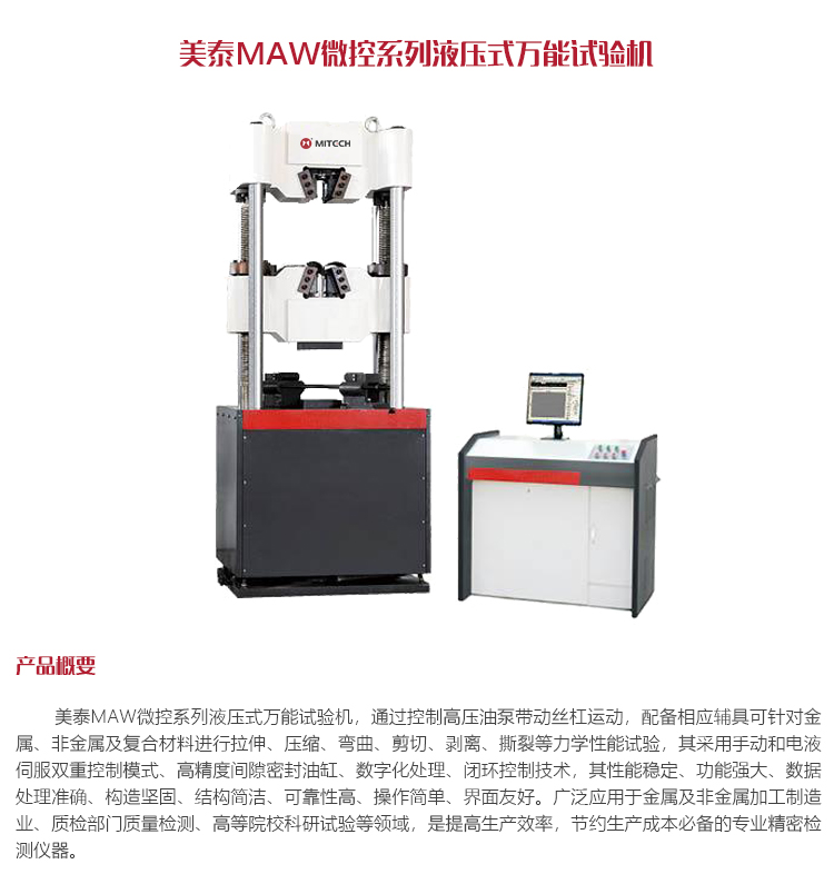 產(chǎn)品概述美泰MAW微控系列液壓式萬(wàn)能試驗(yàn)機(jī),通過(guò)控制高壓油泵帶動(dòng)絲杠運(yùn)動(dòng),配備相應(yīng)輔具可針對(duì)金屬、非金屬及復(fù)合材料進(jìn)行拉伸、壓縮、彎曲、剪切、剝離、撕裂等力學(xué)性能試驗(yàn),其采用手動(dòng)和電液伺服雙重控制模式、高精度間隙密封油缸、數(shù)字化處理、閉環(huán)控制技術(shù),其性能穩(wěn)定、功能強(qiáng)大、數(shù)據(jù)處理準(zhǔn)確、構(gòu)造堅(jiān)固、結(jié)構(gòu)簡(jiǎn)潔、可靠性高、操作簡(jiǎn)單、界面友好。廣泛應(yīng)用于金屬及非金屬加工制造業(yè)、質(zhì)檢部門質(zhì)量檢測(cè)、高等院??蒲性囼?yàn)等領(lǐng)域,是提高生產(chǎn)效率,節(jié)約生產(chǎn)成本必備的專業(yè)精密檢測(cè)儀器。