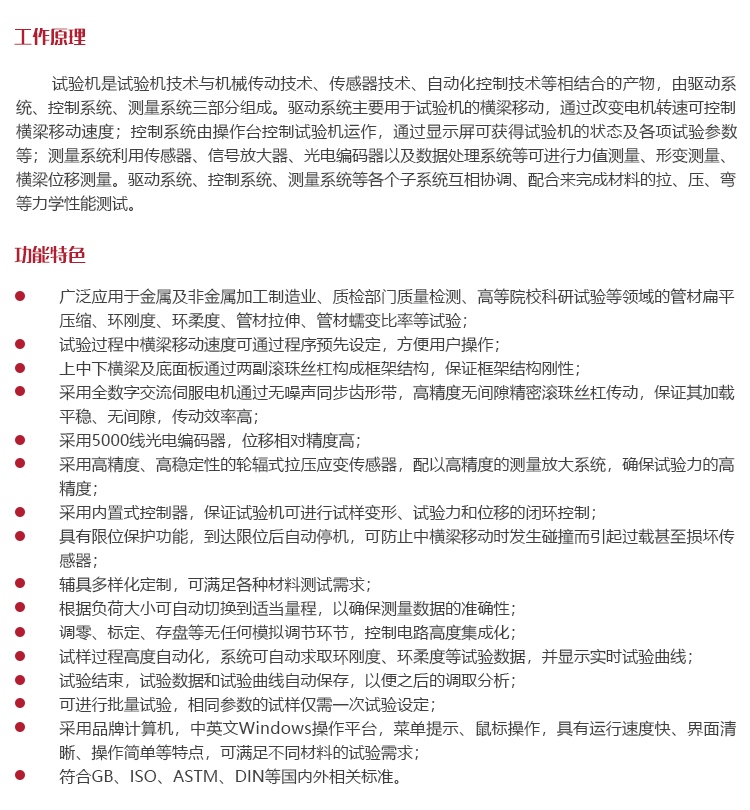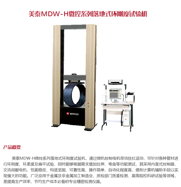 產(chǎn)品概述美泰MDW-H微控系列落地式環(huán)剛度試驗(yàn)機(jī),通過微機(jī)控制電機(jī)帶動(dòng)絲杠運(yùn)動(dòng),可針對各種管材進(jìn)行環(huán)剛度、環(huán)柔度及扁平試驗(yàn),同時(shí)能夠根據(jù)需求增加拉伸、彎曲等功能測試,其采用內(nèi)置式控制器、交流伺服電機(jī),性能穩(wěn)定、構(gòu)造堅(jiān)固、可靠性高、操作簡單、自動(dòng)化程度高,借助計(jì)算機(jī)輔助手段以實(shí)現(xiàn)強(qiáng)大的功能。廣泛應(yīng)用于金屬及非金屬加工制造業(yè)、質(zhì)檢部門質(zhì)量檢測、高等院??蒲性囼?yàn)等領(lǐng)域,是提高生產(chǎn)效率,節(jié)約生產(chǎn)成本必備的專業(yè)精密檢測儀器。