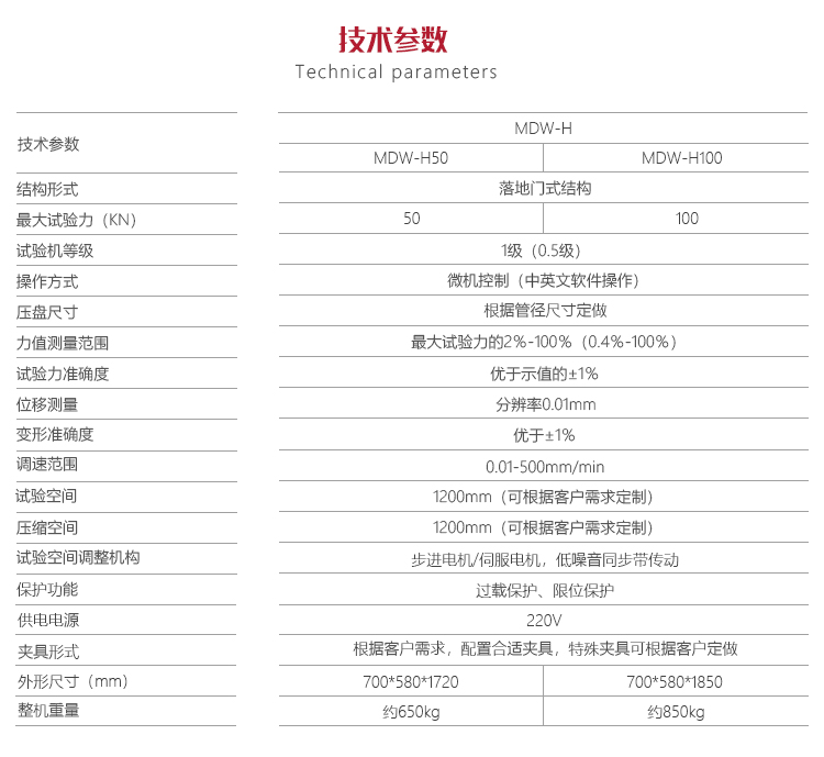 采用臺式單臂雙空間結(jié)構(gòu)來實(shí)現(xiàn)拉壓,橫梁升降可無級調(diào)速;