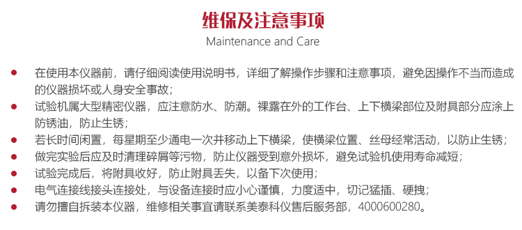 試驗(yàn)機(jī)屬大型精密儀器,應(yīng)注意防水、防潮。裸露在外的工作臺、上下橫梁部位及附具部分應(yīng)涂上防銹油,防止生銹;