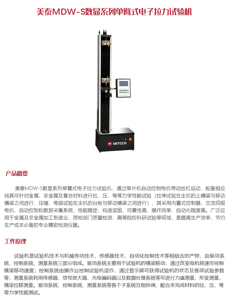 產(chǎn)品概述美泰MDW-S數(shù)顯系列單臂式電子拉力試驗(yàn)機(jī),通過單片機(jī)自動(dòng)控制電機(jī)帶動(dòng)絲杠運(yùn)動(dòng),配備相應(yīng)輔具可針對金屬、非金屬及復(fù)合材料進(jìn)行拉、壓、彎等力學(xué)性能試驗(yàn)(拉伸試驗(yàn)在主機(jī)的上橫梁與移動(dòng)橫梁之間進(jìn)行,壓縮、彎曲試驗(yàn)在主機(jī)的臺板與移動(dòng)橫梁之間進(jìn)行),其采用內(nèi)置式控制器、交流伺服電機(jī)、自動(dòng)控制和數(shù)據(jù)采集系統(tǒng),性能穩(wěn)定、構(gòu)造堅(jiān)固、可靠性高、操作簡單、自動(dòng)化程度高。廣泛應(yīng)用于金屬及非金屬加工制造業(yè)、質(zhì)檢部門質(zhì)量檢測、高等院??蒲性囼?yàn)等領(lǐng)域,是提高生產(chǎn)效率,節(jié)約生產(chǎn)成本必備的專業(yè)精密檢測儀器。
