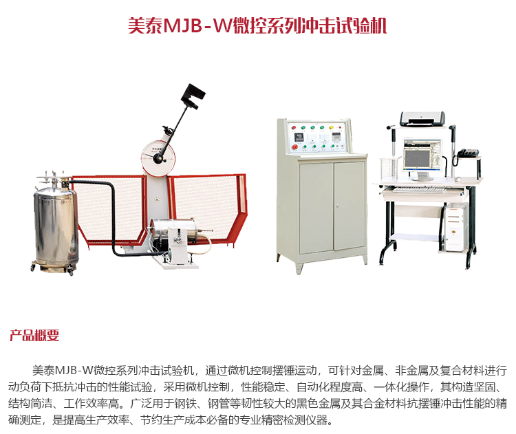 產(chǎn)品概述美泰MJB-W微控系列沖擊試驗(yàn)機(jī),通過微機(jī)控制擺錘運(yùn)動,可針對金屬、非金屬及復(fù)合材料進(jìn)行動負(fù)荷下抵抗沖擊的性能試驗(yàn),采用微機(jī)控制,性能穩(wěn)定、自動化程度高、一體化操作,其構(gòu)造堅(jiān)固、結(jié)構(gòu)簡潔、工作效率高。廣泛用于鋼鐵、鋼管等韌性較大的黑色金屬及其合金材料抗擺錘沖擊性能的精確測定,是提高生產(chǎn)效率、節(jié)約生產(chǎn)成本必備的專業(yè)精密檢測儀器。