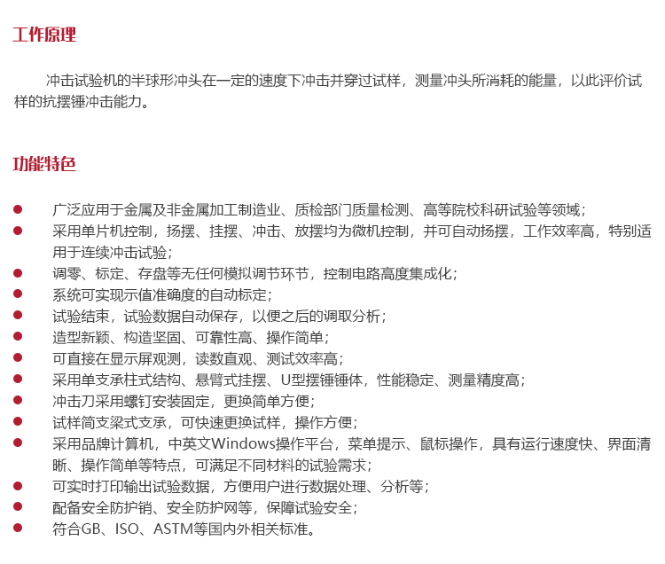 采用單片機(jī)控制,揚(yáng)擺、掛擺、沖擊、放擺均為微機(jī)控制,并可自動揚(yáng)擺,工作效率高,特別適用于連續(xù)沖擊試驗(yàn);