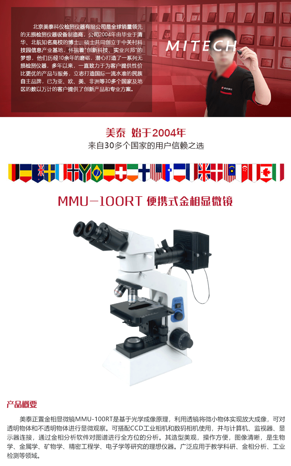 產(chǎn)品概述美泰正置金相顯微鏡MMU-100RT是基于光學成像原理,利用透鏡將微小物體實現(xiàn)放大成像,可對透明物體和不透明物體進行顯微觀察。可搭配CCD工業(yè)相機和數(shù)碼相機使用,并與計算機、監(jiān)視器、顯示器連接,通過金相分析軟件對圖譜進行全方位的分析。其造型美觀,操作方便,圖像清晰,是生物學、金屬學、礦物學、精密工程學、電子學等研究的理想儀器。廣泛應用于教學科研、金相分析、工業(yè)檢測等領域。