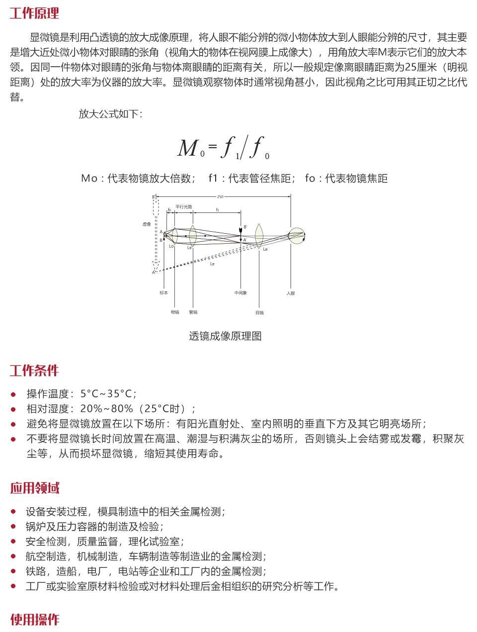 工作原理顯微鏡是利用凸透鏡的放大成像原理,將人眼不能分辨的微小物體放大到人眼能分辨的尺寸,其主要是增大近處微小物體對眼睛的張角(視角大的物體在視網(wǎng)膜上成像大),用角放大率M表示它們的放大本領。因同一件物體對眼睛的張角與物體離眼睛的距離有關,所以一般規(guī)定像離眼睛距離為25厘米(明視距離)處的放大率為儀器的放大率。顯微鏡觀察物體時通常視角甚小,因此視角之比可用其正切之比代替。