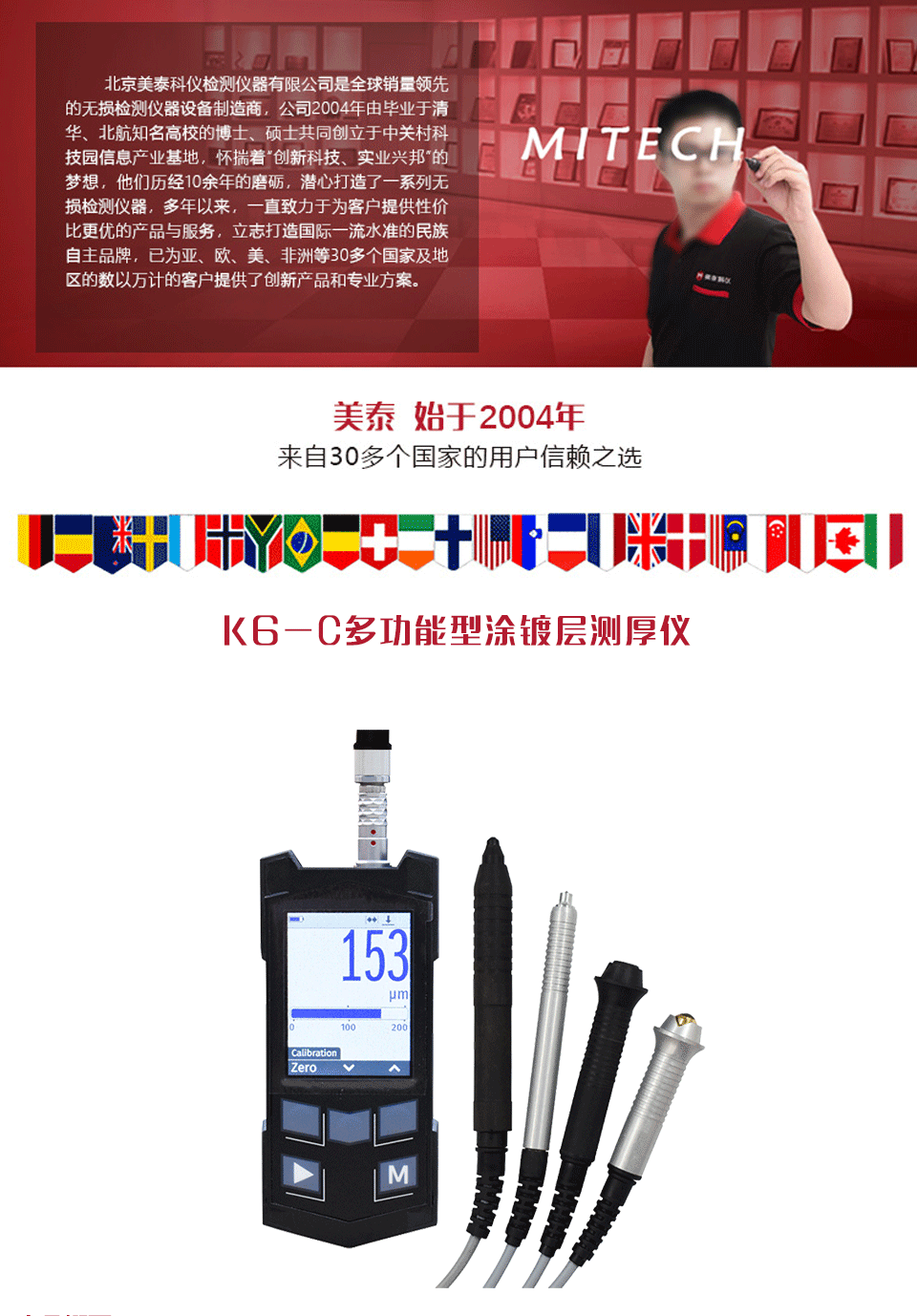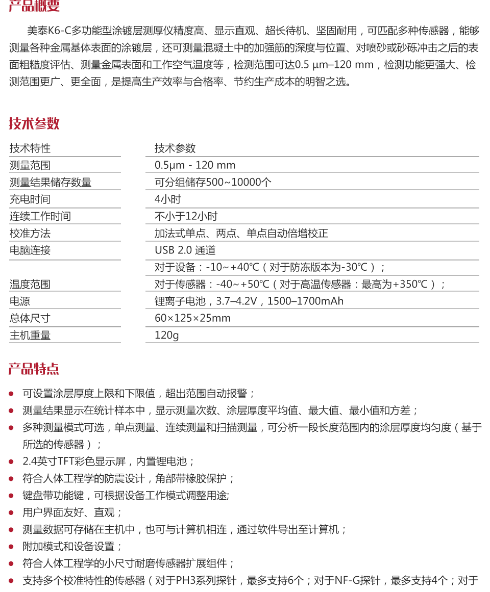 美泰K6-C多功能型涂鍍層測厚儀精度高、顯示直觀、超長待機、堅固耐用,可匹配多種傳感器,能夠測量各種金屬基體表面的涂鍍層,還可測量混凝土中的加強筋的深度與位置、對噴砂或砂礫沖擊之后的表面粗糙度評估、測量金屬表面和工作空氣溫度等,檢測范圍可達(dá)0.5 μm–120 mm,檢測功能更強大、檢測范圍更廣、更全面,是提高生產(chǎn)效率與合格率、節(jié)約生產(chǎn)成本的明智之選。