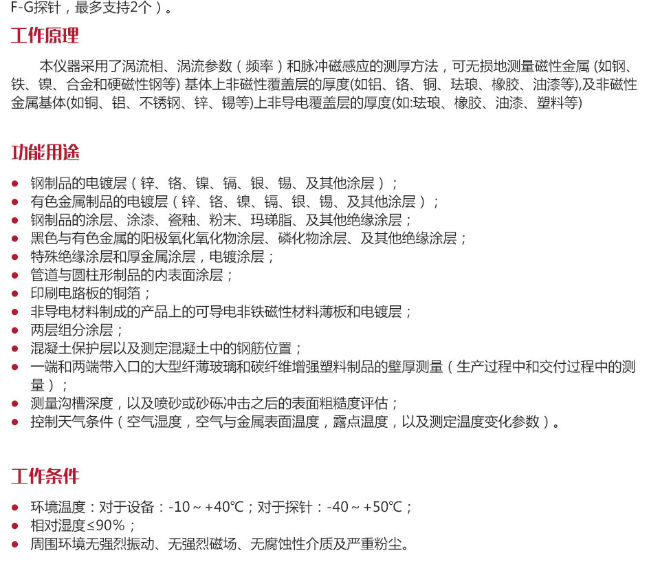 工作原理本儀器采用了渦流相、渦流參數(shù)(頻率)和脈沖磁感應(yīng)的測厚方法,可無損地測量磁性金屬 (如鋼、鐵、鎳、合金和硬磁性鋼等) 基體上非磁性覆蓋層的厚度(如鋁、鉻、銅、琺瑯、橡膠、油漆等),及非磁性金屬基體(如銅、鋁、不銹鋼、鋅、錫等)上非導(dǎo)電覆蓋層的厚度(如:琺瑯、橡膠、油漆、塑料等)