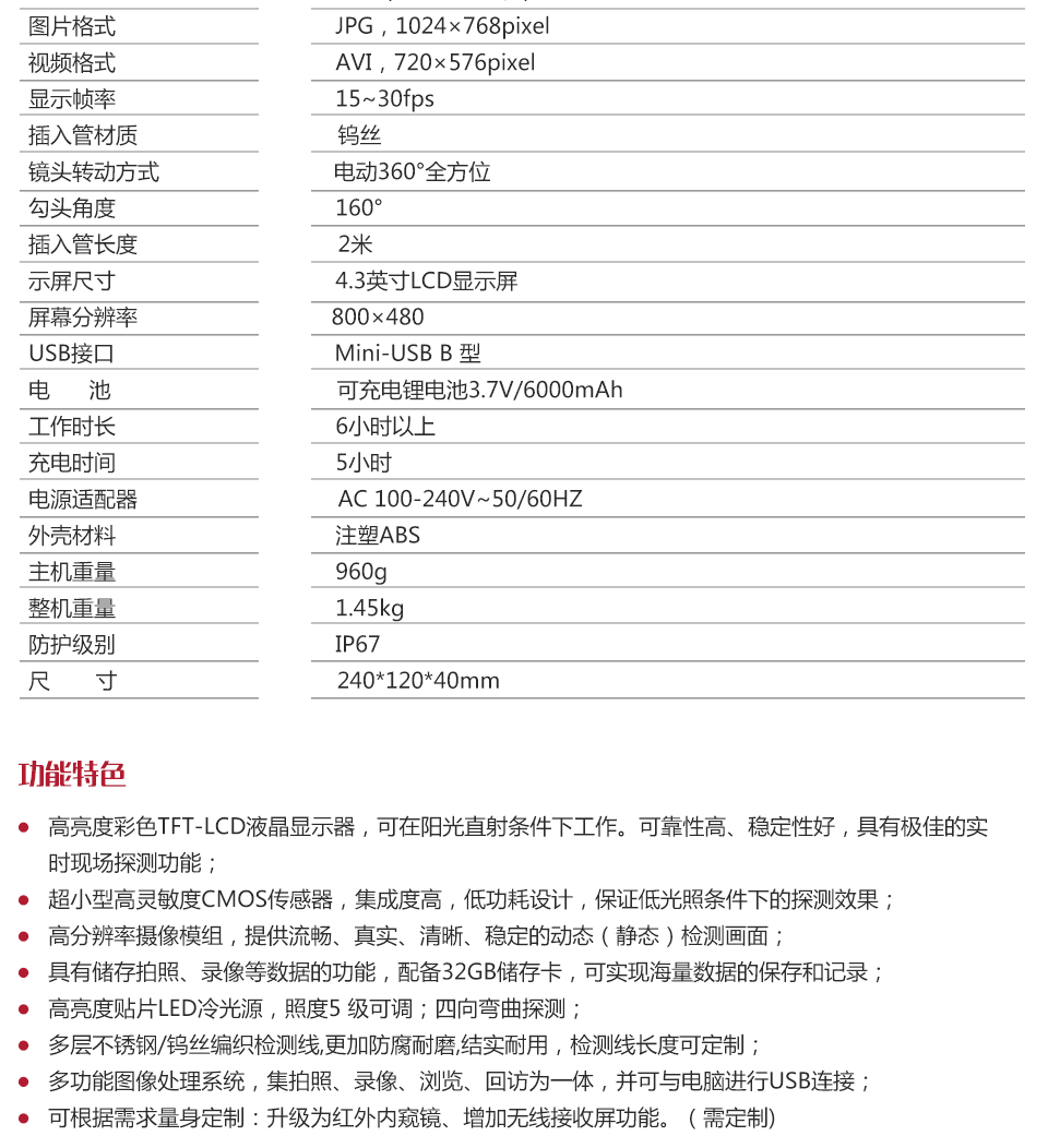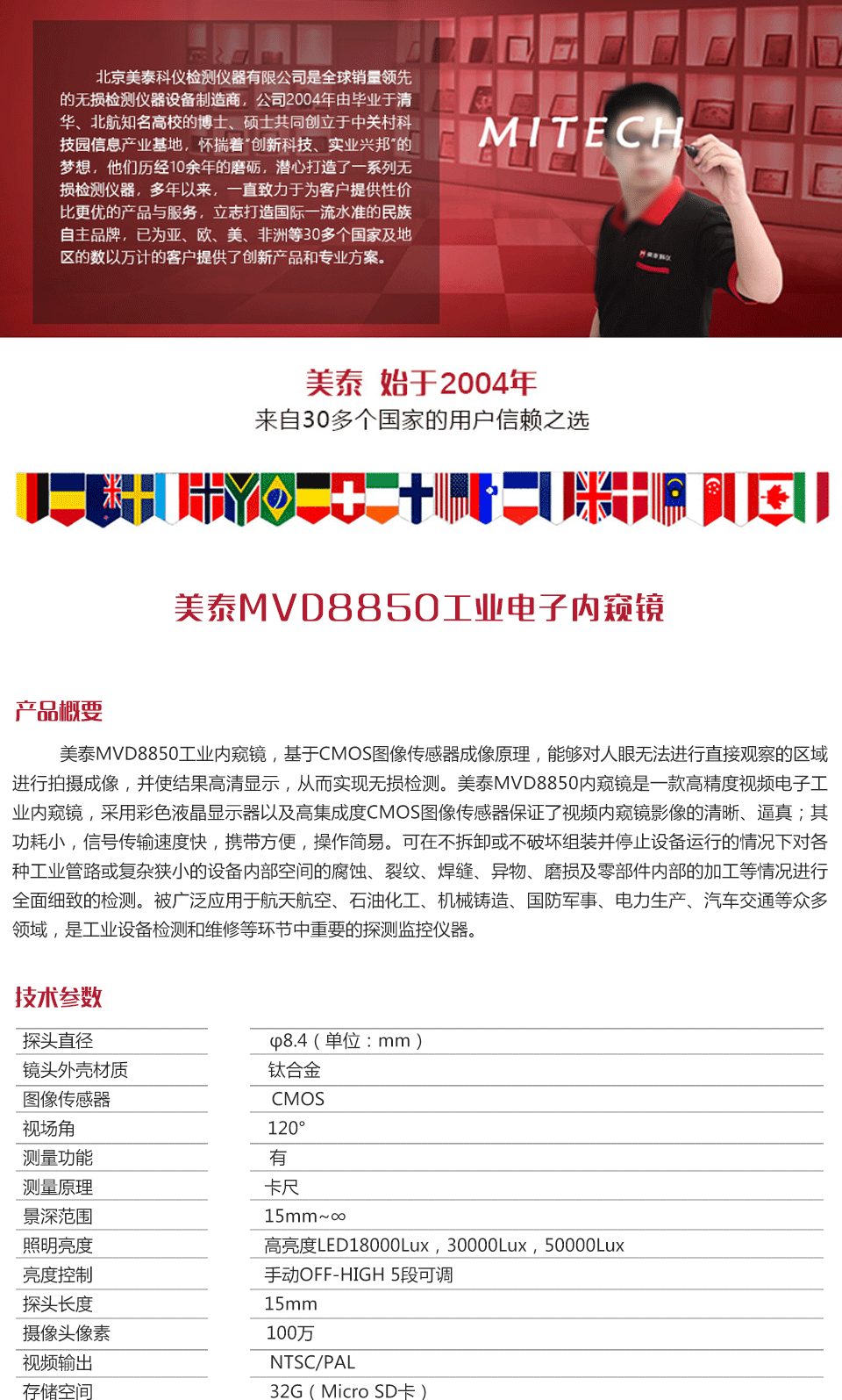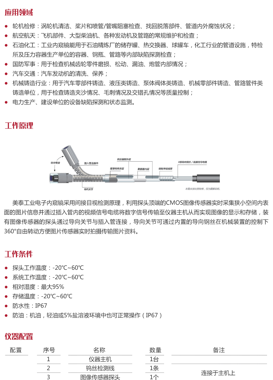 產(chǎn)品概述美泰MVD8850工業(yè)內(nèi)窺鏡,基于CMOS圖像傳感器成像原理,能夠對(duì)人眼無(wú)法進(jìn)行直接觀察的區(qū)域進(jìn)行拍攝成像,并使結(jié)果高清顯示,從而實(shí)現(xiàn)無(wú)損檢測(cè)。美泰MVD8850內(nèi)窺鏡是一款高精度視頻電子工業(yè)內(nèi)窺鏡,采用彩色液晶顯示器以及高集成度CMOS圖像傳感器保證了視頻內(nèi)窺鏡影像的清晰、逼真;其功耗小,信號(hào)傳輸速度快,攜帶方便,操作簡(jiǎn)易??稍?/span>不拆卸或不破壞組裝并停止設(shè)備運(yùn)行的情況下對(duì)各種工業(yè)管路或復(fù)雜狹小的設(shè)備內(nèi)部空間的腐蝕、裂紋、焊縫、異物、磨損及零部件內(nèi)部的加工等情況進(jìn)行全面細(xì)致的檢測(cè)。被廣泛應(yīng)用于航天航空、石油化工、機(jī)械鑄造、國(guó)防軍事、電力生產(chǎn)、汽車交通等眾多領(lǐng)域,是工業(yè)設(shè)備檢測(cè)和維修等環(huán)節(jié)中重要的探測(cè)監(jiān)控儀器。