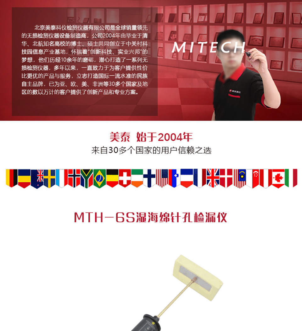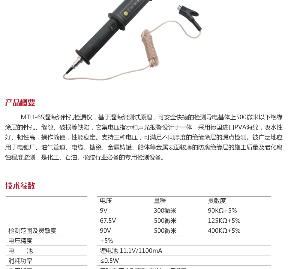 MTH-6S濕海綿針孔檢漏儀,基于濕海綿測試原理,可安全快捷的檢測導電基體上500微米以下絕緣涂層的針孔、縫隙、破損等缺陷,它集電壓指示和聲光報警設計于一體,采用德國進口PVA海綿,吸水性好、韌性高,操作簡便,性能穩(wěn)定。支持三種電壓,可滿足不同厚度的絕緣涂層的漏點檢測。被廣泛地應用于電鍍廠、油氣管道、電纜、搪瓷、金屬鑄罐、船體等金屬表面較薄的防腐絕緣層的施工質量及老化腐蝕程度監(jiān)測,是化工、石油、橡膠行業(yè)必備的專用檢測設備。
