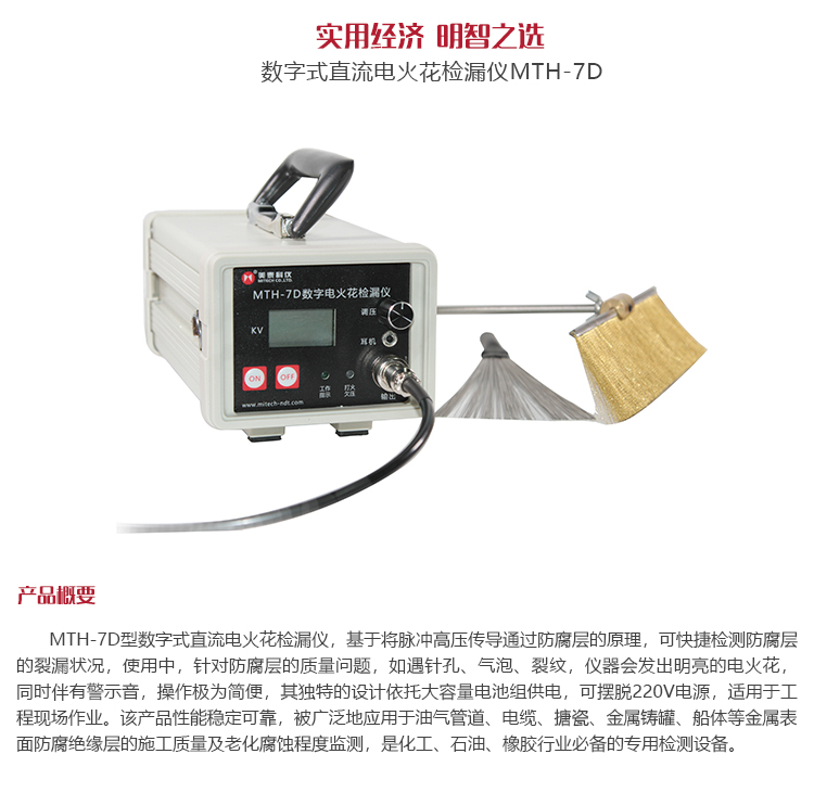 產(chǎn)品概述MTH-7D型數(shù)字式直流電火花檢漏儀,基于將脈沖高壓傳導(dǎo)通過防腐層的原理,可快捷檢測(cè)防腐層的裂漏狀況。使用中,針對(duì)防腐層的質(zhì)量問題,如遇針孔、氣泡、裂紋,儀器會(huì)發(fā)出明亮的電火花,同時(shí)伴有警示音,操作極為簡(jiǎn)便,其獨(dú)特的設(shè)計(jì)依托大容量電池組供電,可擺脫220V電源,適用于工程現(xiàn)場(chǎng)作業(yè)。該產(chǎn)品性能穩(wěn)定可靠,被廣泛地應(yīng)用于油氣管道、電纜、搪瓷、金屬鑄罐、船體等金屬表面防腐絕緣層的施工質(zhì)量及老化腐蝕程度監(jiān)測(cè),是化工、石油、橡膠行業(yè)必備的專用檢測(cè)設(shè)備。