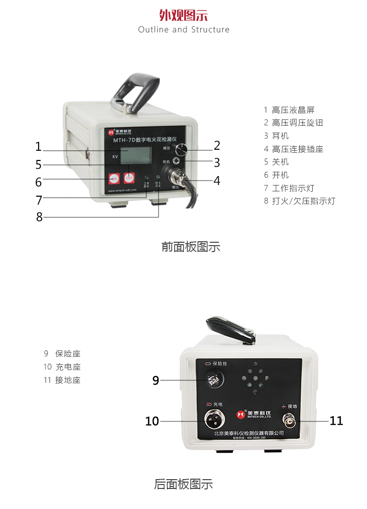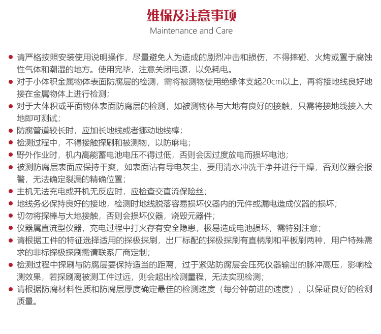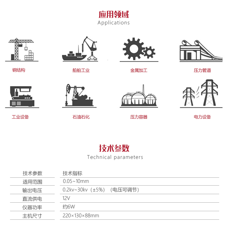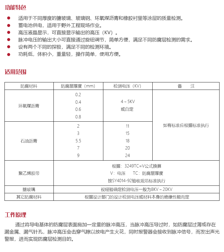 可快速檢測(cè)搪玻璃罐外壁、閥門管道、玻璃鋼管道、環(huán)氧煤瀝青、橡膠襯里等防腐層的裂漏狀況。