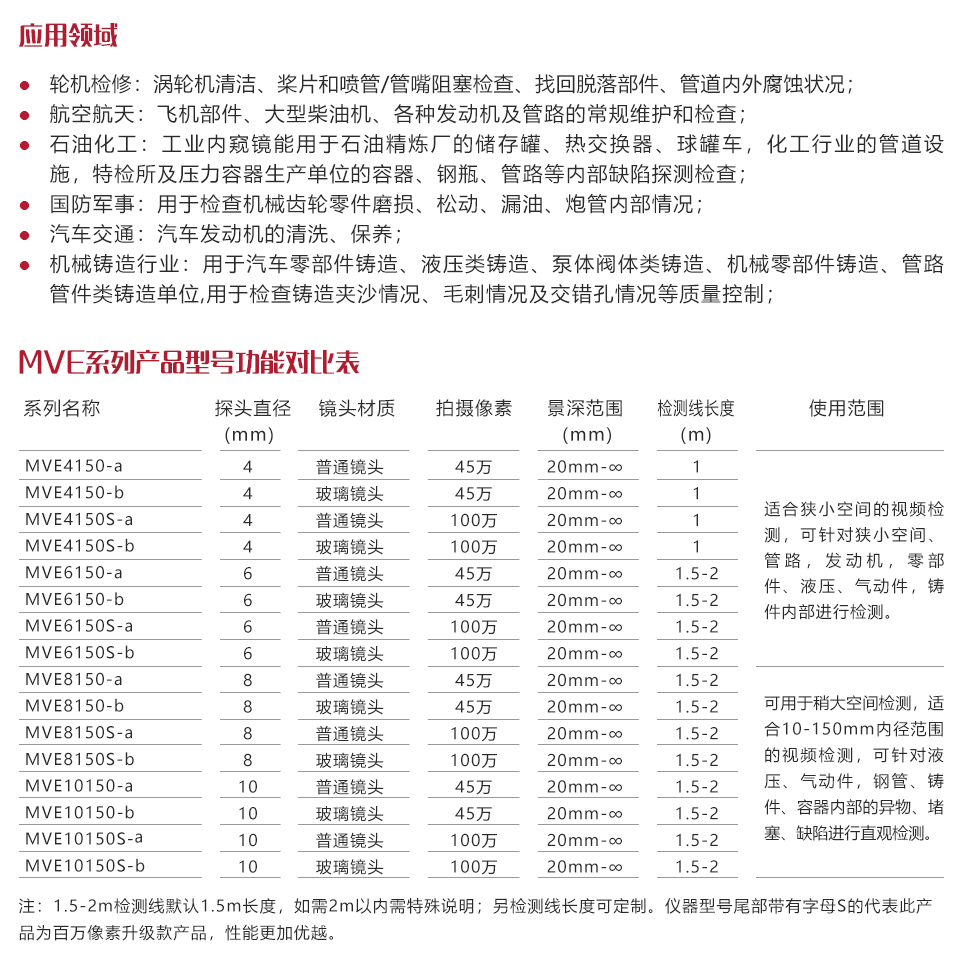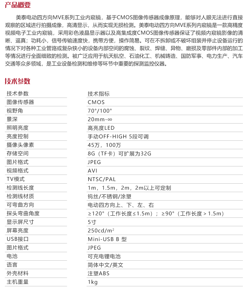 美泰電動(dòng)四方向MVE系列工業(yè)內(nèi)窺鏡,基于CMOS圖像傳感器成像原理,能夠?qū)θ搜蹮o法進(jìn)行直接觀察的區(qū)域進(jìn)行拍攝成像,高清顯示,從而實(shí)現(xiàn)無損檢測(cè)。美泰電動(dòng)四方向MVE系列內(nèi)窺鏡是一款高精度視頻電子工業(yè)內(nèi)窺鏡,采用彩色液晶顯示器以及高集成度CMOS圖像傳感器保證了視頻內(nèi)窺鏡影像的清晰、逼真;功耗小,信號(hào)傳輸速度快,攜帶方便,操作簡(jiǎn)易??稍?/span>不拆卸或不破壞組裝并停止設(shè)備運(yùn)行的情況下對(duì)各種工業(yè)管路或復(fù)雜狹小的設(shè)備內(nèi)部空間的腐蝕、裂紋、焊縫、異物、磨損及零部件內(nèi)部的加工等情況進(jìn)行全面細(xì)致的檢測(cè)。被廣泛應(yīng)用于航天航空、石油化工、機(jī)械鑄造、國(guó)防軍事、電力生產(chǎn)、汽車交通等眾多領(lǐng)域,是工業(yè)設(shè)備檢測(cè)和維修等環(huán)節(jié)中重要的探測(cè)監(jiān)控儀器。