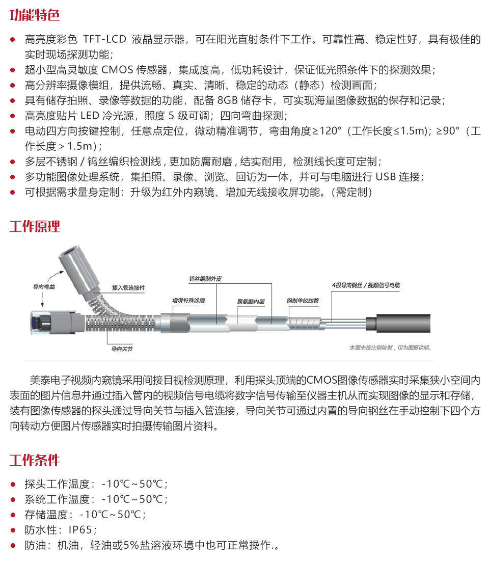 工作原理美泰電子視頻內(nèi)窺鏡采用間接目視檢測(cè)原理,利用探頭頂端的CMOS圖像傳感器實(shí)時(shí)采集狹小空間內(nèi)表面的圖片信息并通過插入管內(nèi)的視頻信號(hào)電纜將數(shù)字信號(hào)傳輸至儀器主機(jī)從而實(shí)現(xiàn)圖像的顯示和存儲(chǔ),裝有圖像傳感器的探頭通過導(dǎo)向關(guān)節(jié)與插入管連接,導(dǎo)向關(guān)節(jié)可通過內(nèi)置的導(dǎo)向鋼絲在微型電機(jī)控制下四個(gè)方向轉(zhuǎn)動(dòng)方便圖片傳感器實(shí)時(shí)拍攝傳輸圖片資料。